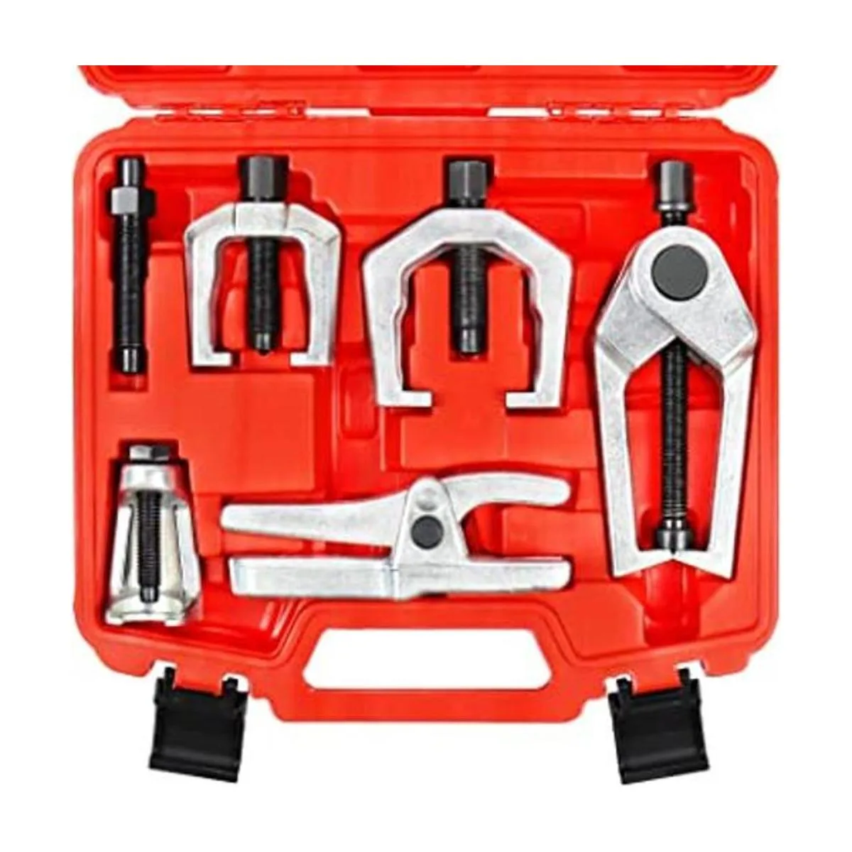 Este kit de extractor de rótula incluye 1 separador de rótula, 1 extractor de extremo de barra de acoplamiento y rótula, 1 extractor de brazo cónico Pitman, 1 brazo Pitman y extractor de extremo de barra de acoplamiento, 1 extractor de brazo Pitman, y todas las 5 herramientas están organizadas en un estuche de moldeo rojo para un fácil almacenamiento y transporte. Las 5 herramientas de extracción utilizan forma de C, forma de mandíbula y diseño en forma de lágrima, muy simple, pero pueden colocarse firmemente en la posición de la rótula y proporcionar un agarre muy eficaz para fijar los tiradores.