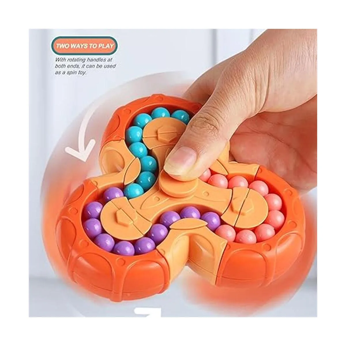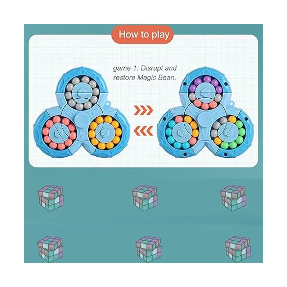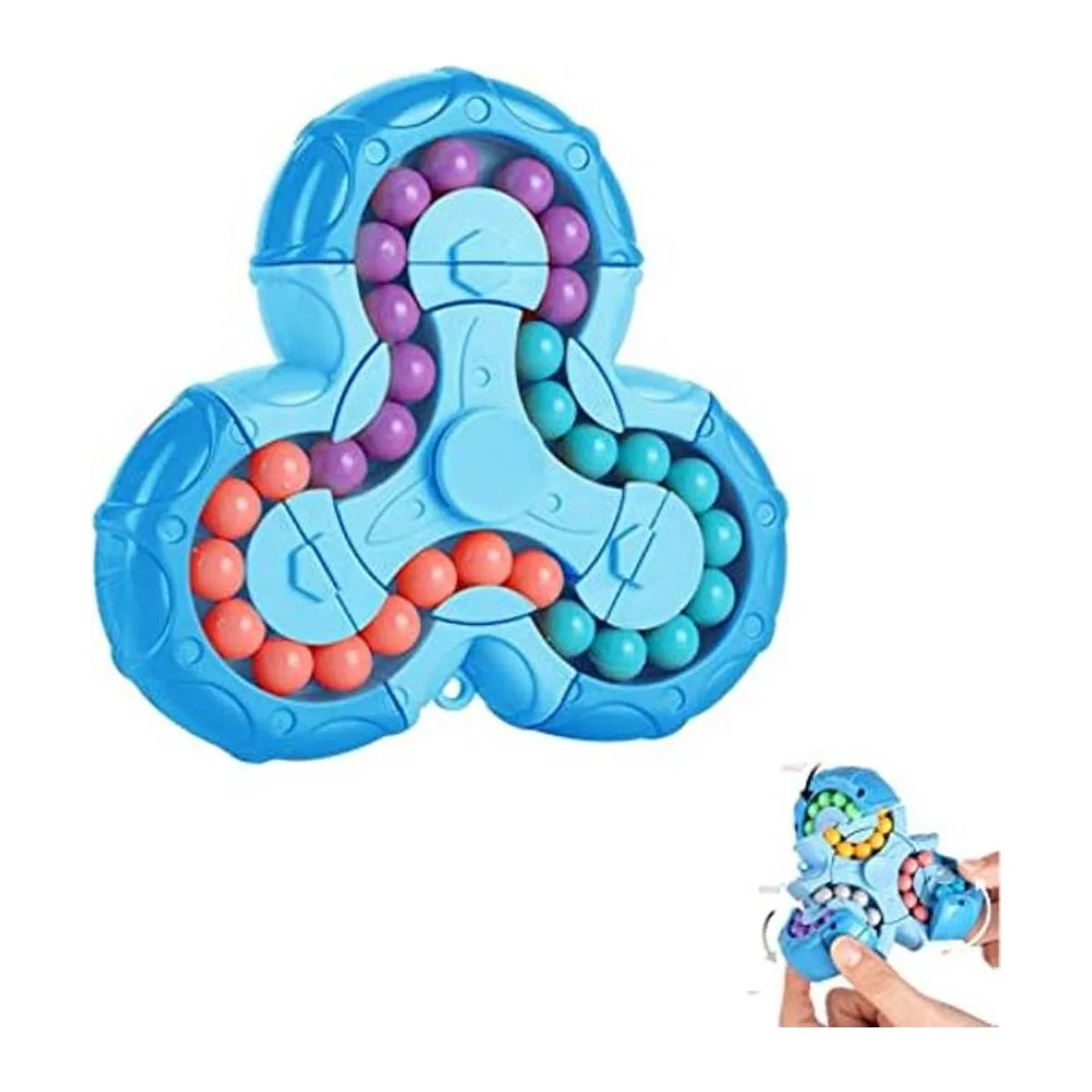 Juguete giratorio para dedos: el juguete giratorio Magic Bean es de doble cara y consta de 6 colores diferentes y 60 granos mágicos. Se divide en 3 círculos, la parte superior e interior de los cuales se pueden girar, y cada cuenta está firmemente incrustada en ella, y no se cae fácilmente. Girar el círculo medio puede conectar 3 círculos de cuentas. Puedes mover las cuentas libremente con ambas manos y cambiar las cuentas a diferentes colores. Luego vuelve a todos los mismos colores que antes.