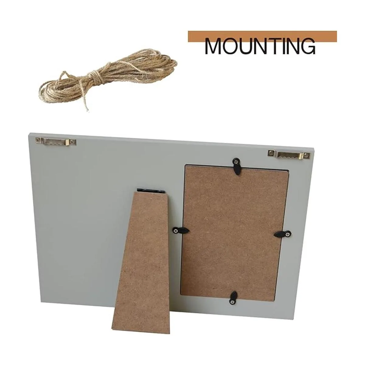 Construcción resistente: el total mide 11 x 7.7 pulgadas. Capacidad para fotos de 4 x 6 pulgadas que es fácil de cambiar, completo con frontal de vidrio grueso. Caballete trasero para exhibición de mesa, diente de sierra fácil de montar en la pared, cuerda de yute incluida.
