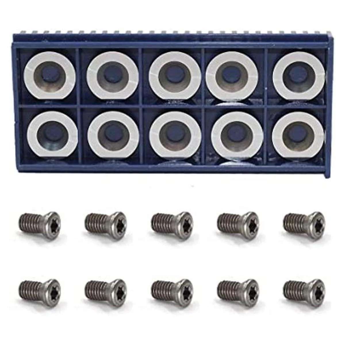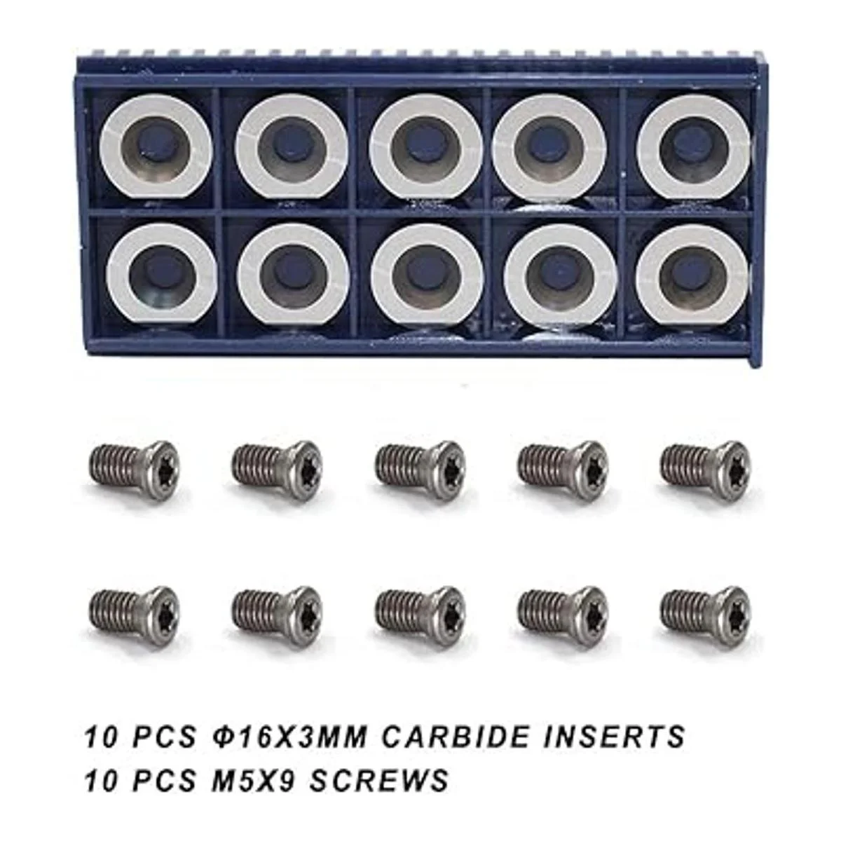 Per pack of 10 pcs round carbide insert cutters, Size DIA 16mm X THICK3mm30,comes with 10pcs M5X9mm Flat head screws for your convenience.