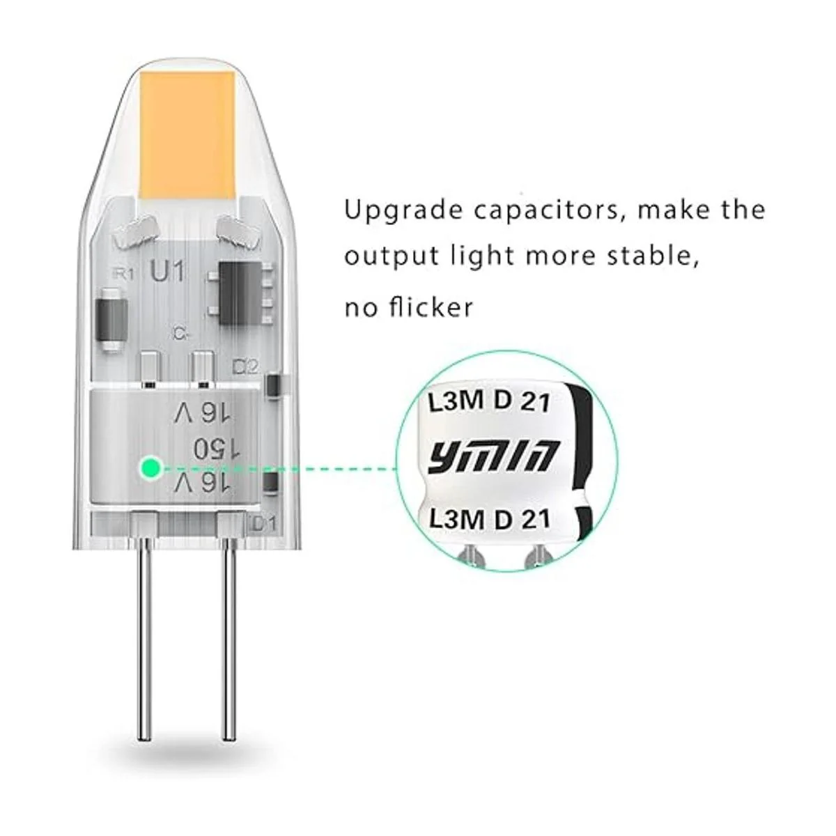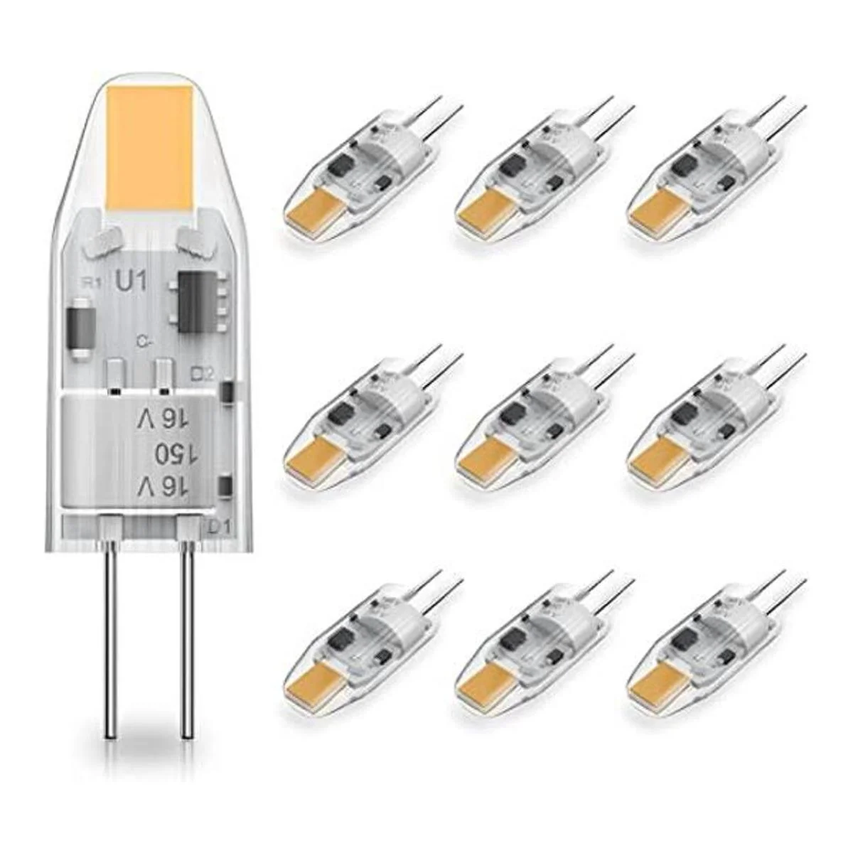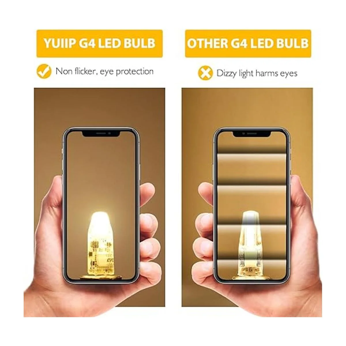Yuiip Bombilla LED G4 sin parpadeo, base de bipin de 2700 K, luz blanca cálida, a prueba de polvo, 12 V, 10 W, repuesto halógeno 2 generación a prueba de golpes, lámpara ACDC para paisaje, caravana, paquete de 10