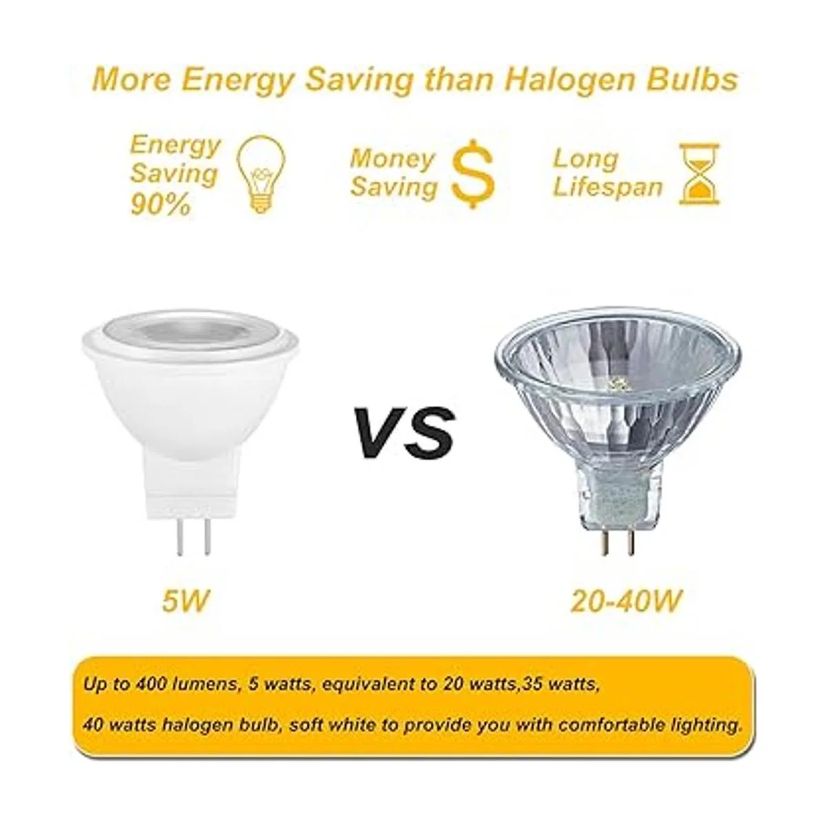 Ahorra electricidad y dinero: bombillas LED AC/DC 12 V 5 W MR11, un reemplazo perfecto de bombilla halógena de 20 W, 35 W, 40 W, ahorra un 90 en la factura de la luz. Encendido instantáneo, sin tiempo de espera para calentar hasta un brillo completo. Sin parpadeo ni zumbido con transformador LED compatible. El ángulo de haz de 38 crea un foco enfocado adecuado para tu habitación.