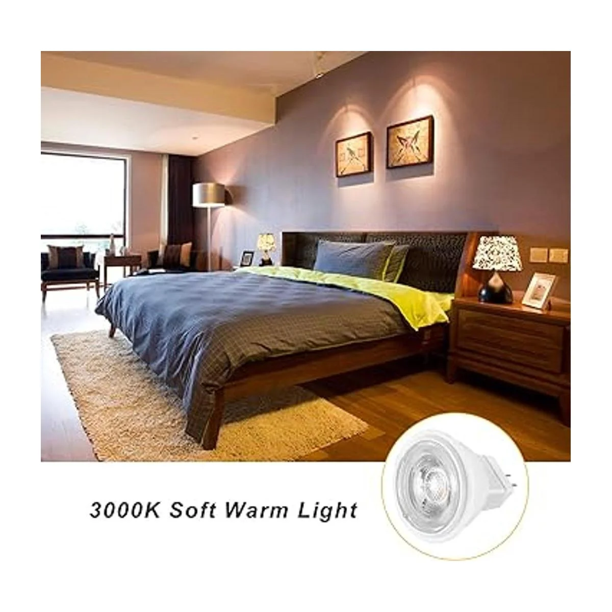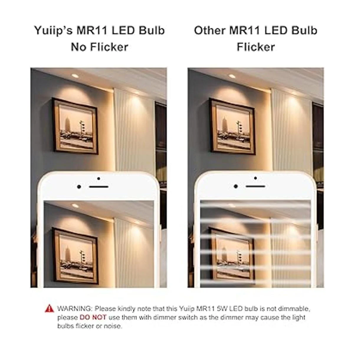 Alto CRI y no regulable: luces más vívidas y naturales con alta CRI 83. La lámpara MR11 proporciona 400 lúmenes de luz blanca cálida suave de 3000 K sin parpadeo ni ruidos. Bombillas LED MR11 de 5 W no regulables, por favor, no las utilices con regulador de intensidad y mejor cooperación con más LED para cumplir con el mínimo requerimiento de potencia del transformador, para evitar crear estroboscópica para trabajar en un circuito de potencia excesivamente alto.