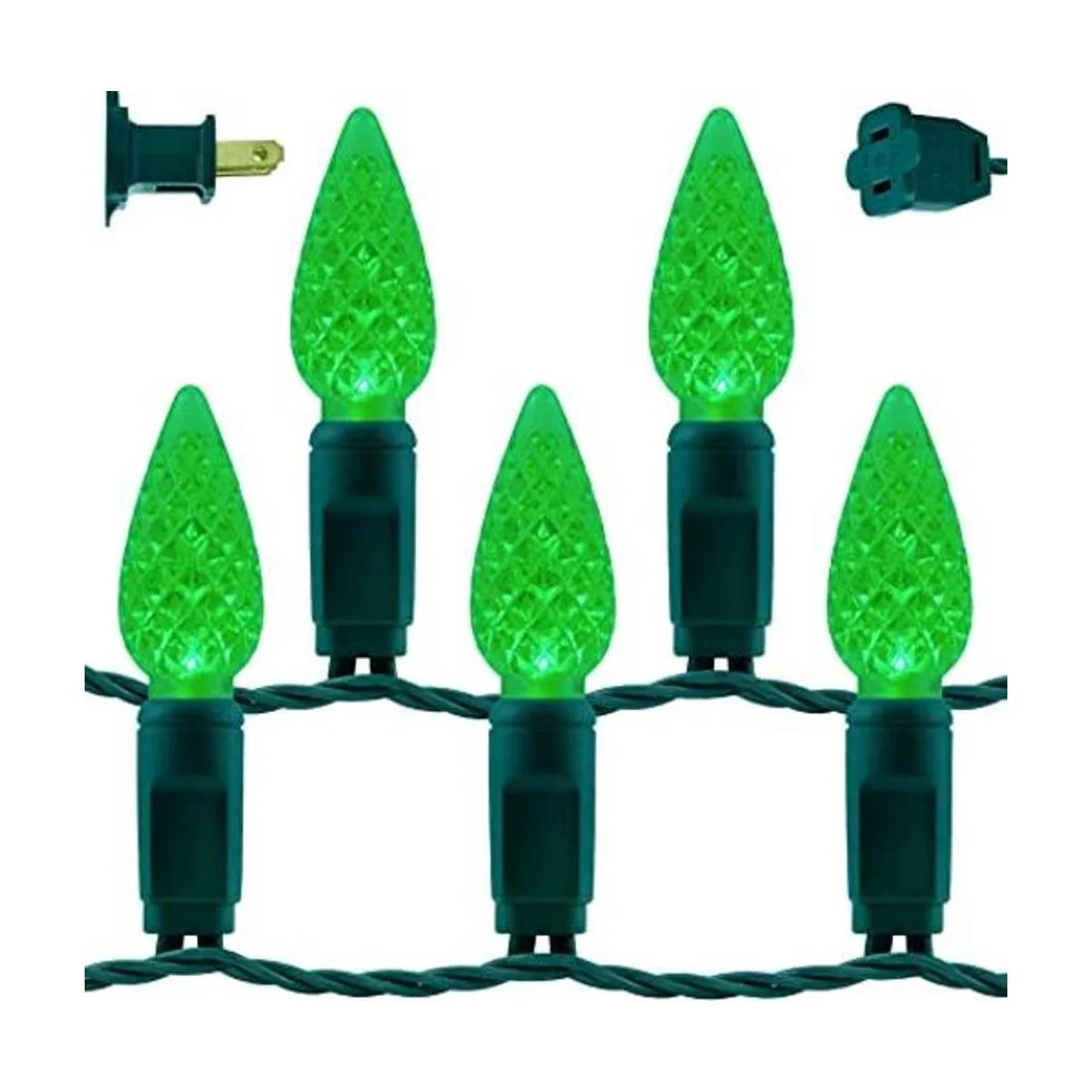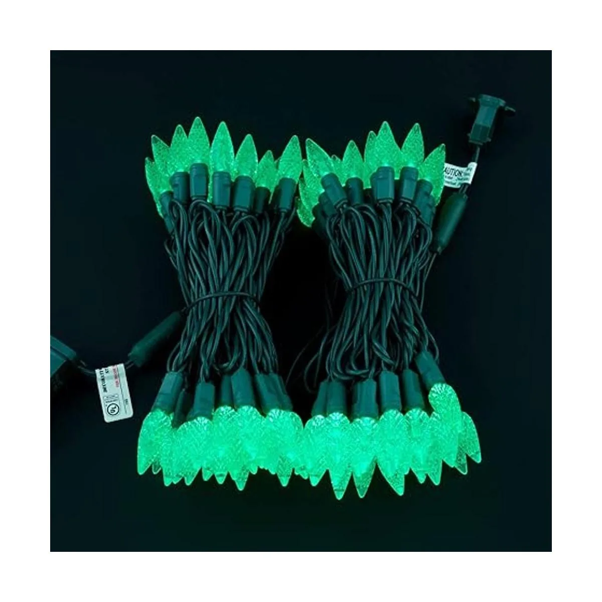 Especificaciones: 100 bombillas LED C6 de fresa verde en cable verde, la longitud total de la sección iluminada es de 33 pies, espacio de 4 pulgadas, cables de 4 pulgadas, colas de 4 pulgadas. Los enchufes hembra y los enchufes macho apilables se pueden conectar para proporcionar un uso prolongado de conexiones de extremo a extremo. La potencia real de toda la cadena de luces es de 7,2 vatios y la potencia máxima conectada nominal es de 216 vatios con hasta 30 hebras funcionando simultáneamente.
