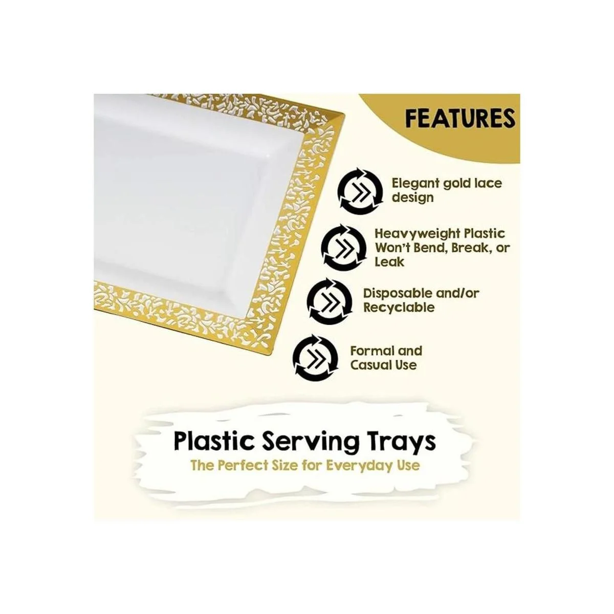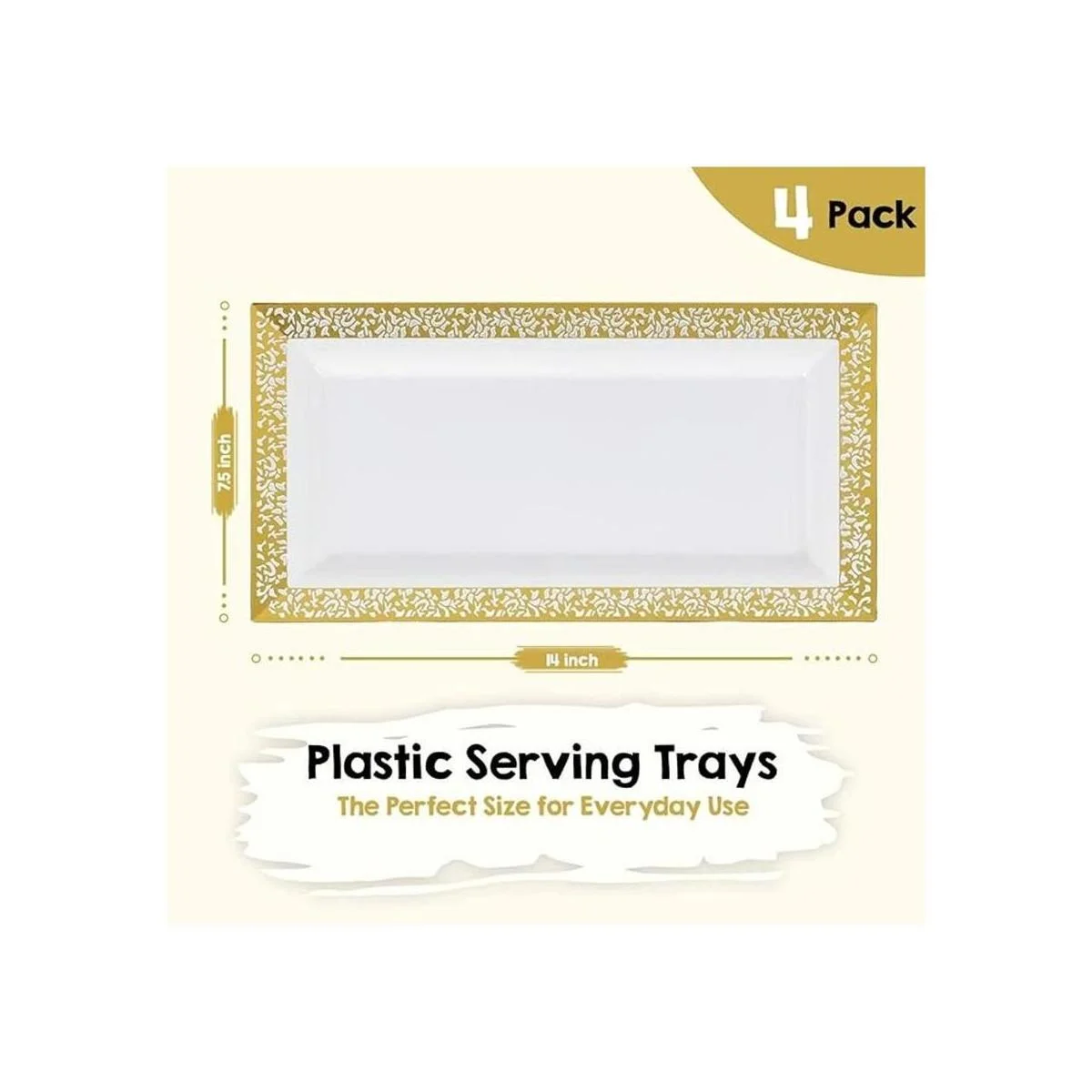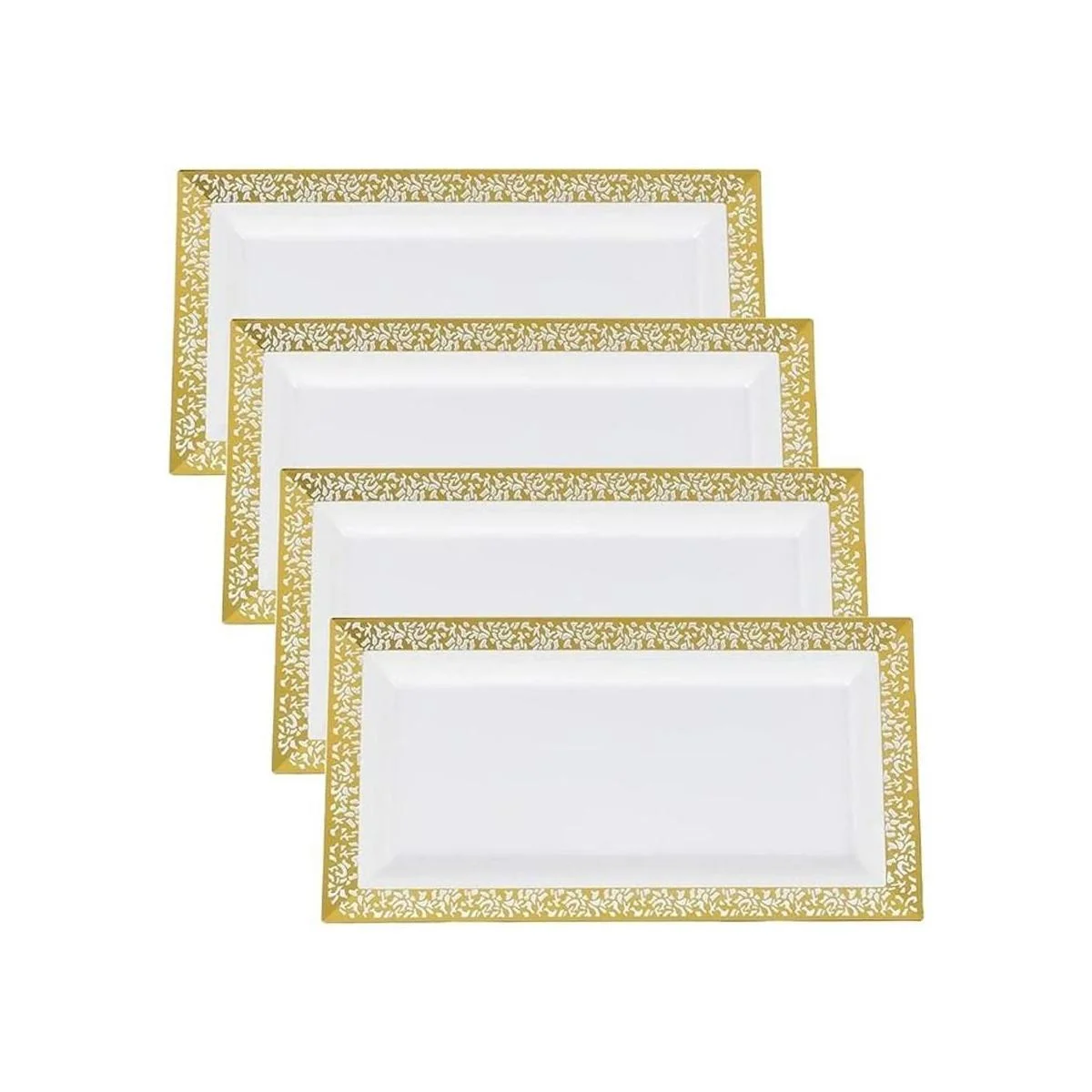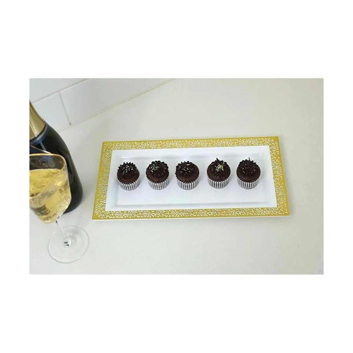 Yumchikel Elegante juego de bandejas y platos de plástico 4 unidades Bandejas y platos desechables con borde blanco y dorado para alimentos bodas, fiestas de lujo, mesa de postre, exhibición de magdalenas, 7.5 x 14 pulgadas