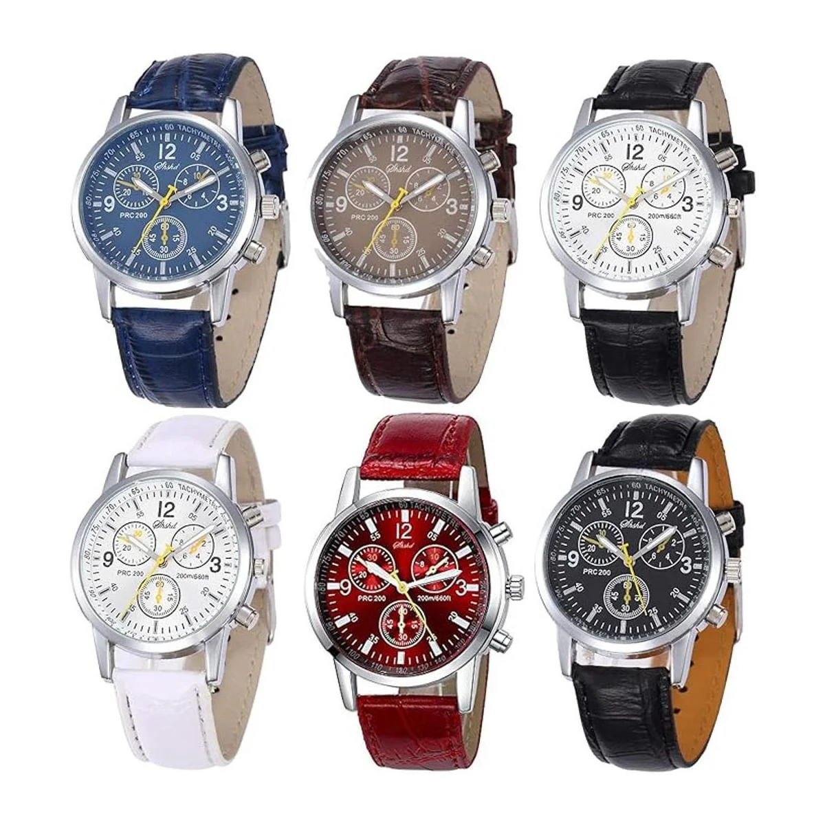 El paquete incluye: 6 relojes de cuero en rojo, azul oscuro, marrón, negro con cara plateada, negro con cara negra, blanco, fijo para tu salida diaria