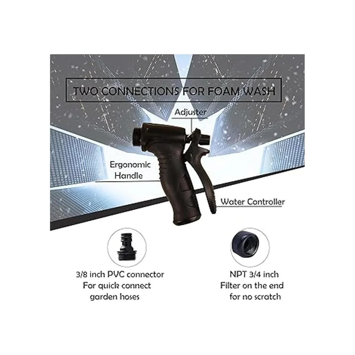 Se adapta a la mayoría de mangueras: esta de espuma para lavadora de coche viene con un conector rápido, puedes conectar tu manguera rápidamente. Y si tu manguera es de rosca estándar estadounidense de 3/4 pies, puedes destripar el conector qucik con llave, entonces también puedes conectar tu manguera pronto.