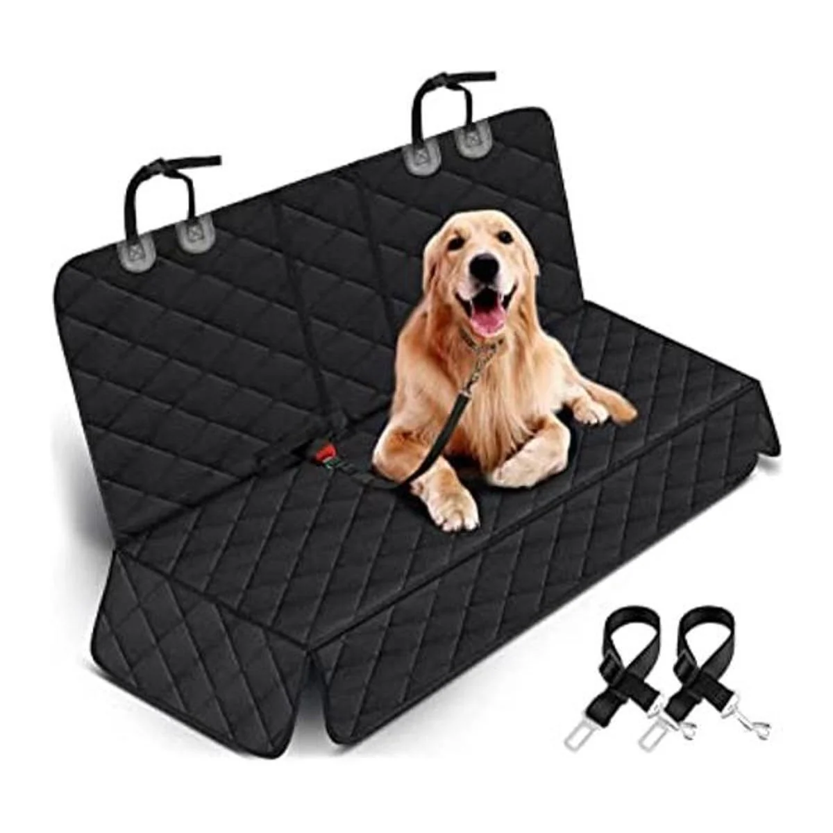 Cinturones de seguridad ajustables y correas para reposacabezas: las correas para el reposacabezas de la funda del asiento del coche son ajustables, puedes apretarlas o aflojarlas según sea necesario. Al mismo tiempo, la funda de asiento trasero para perros viene con 2 cinturones de seguridad, puedes ajustar la longitud adecuada para tus mascotas, luego insertar en las hebillas de tu cinturón de seguridad trasero para mantener a tu mascota más segura en el asiento trasero de tu coche.