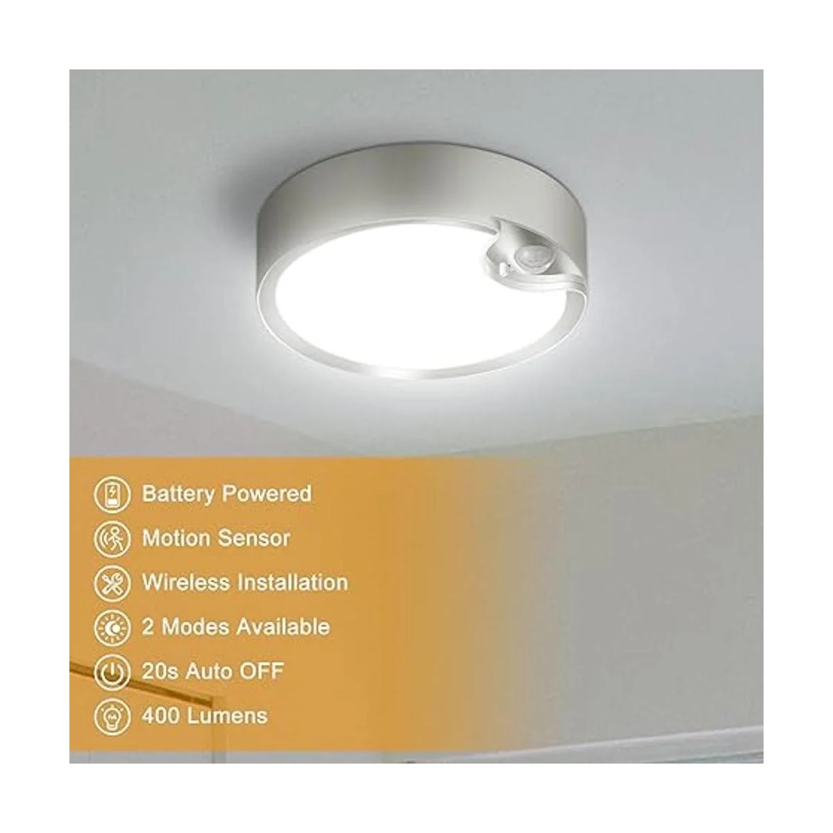Luz con sensor de movimiento: detector de movimiento infrarrojo PIR integrado, esta luz de techo LED se enciende al instante cuando detecta movimiento de hasta 18 pies de distancia bajo ambiente oscuro. Y se apaga automáticamente después de 20 segundos cuando no se detecta movimiento, conservando la duración de la batería.