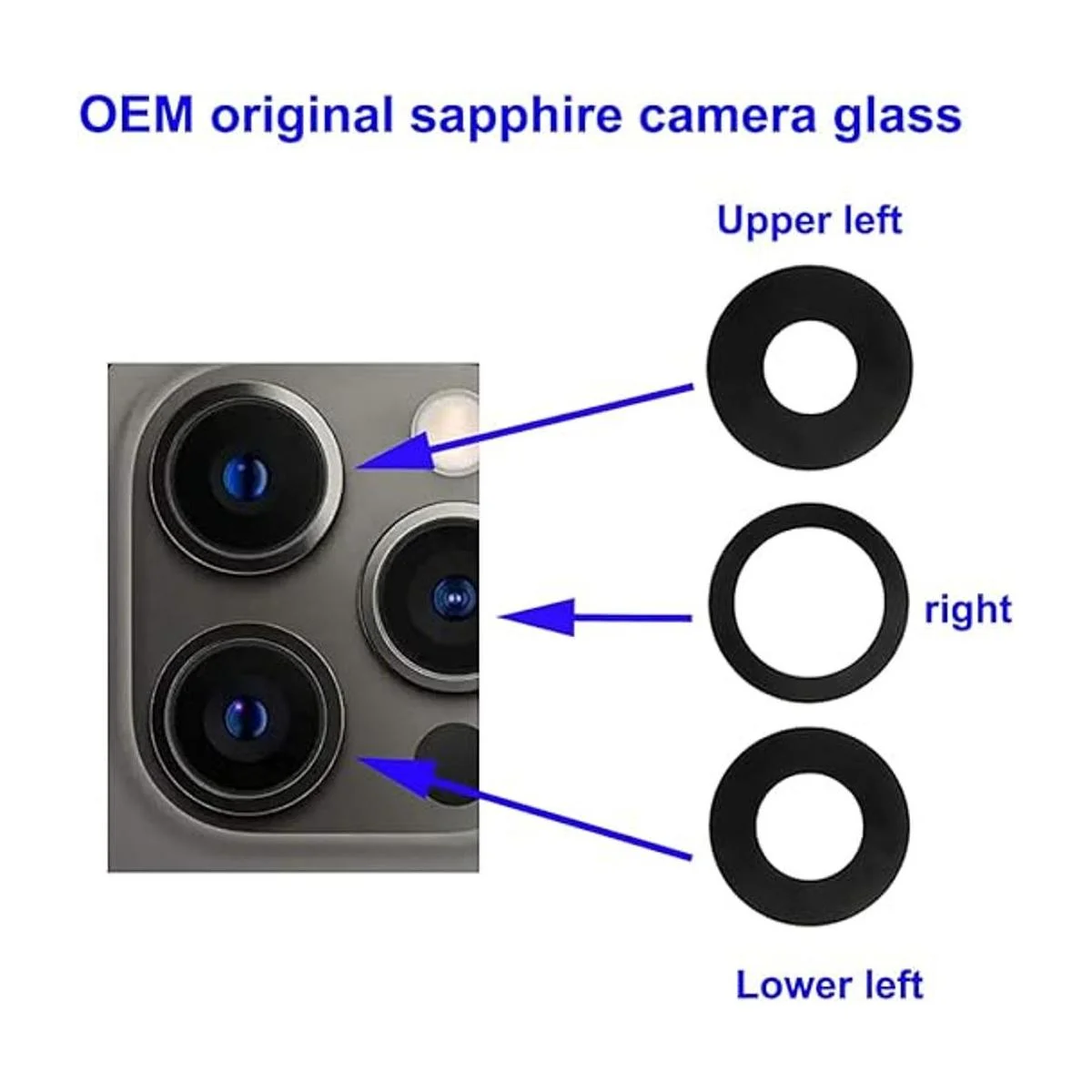 Cristal de cámara de zafiro OEM. Lente de cristal de zafiro OEM para iPhone 12 Pro Max. Total de 3 piezas de vidrio para cámara con fuerte adhesivo preinstalado. Fácil de usar. Solo tienes que quitar el papel protector cuando lo instales utilizando las pinzas para quitar el papel protector