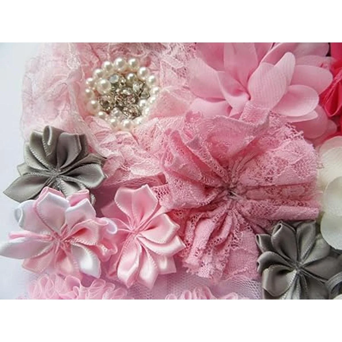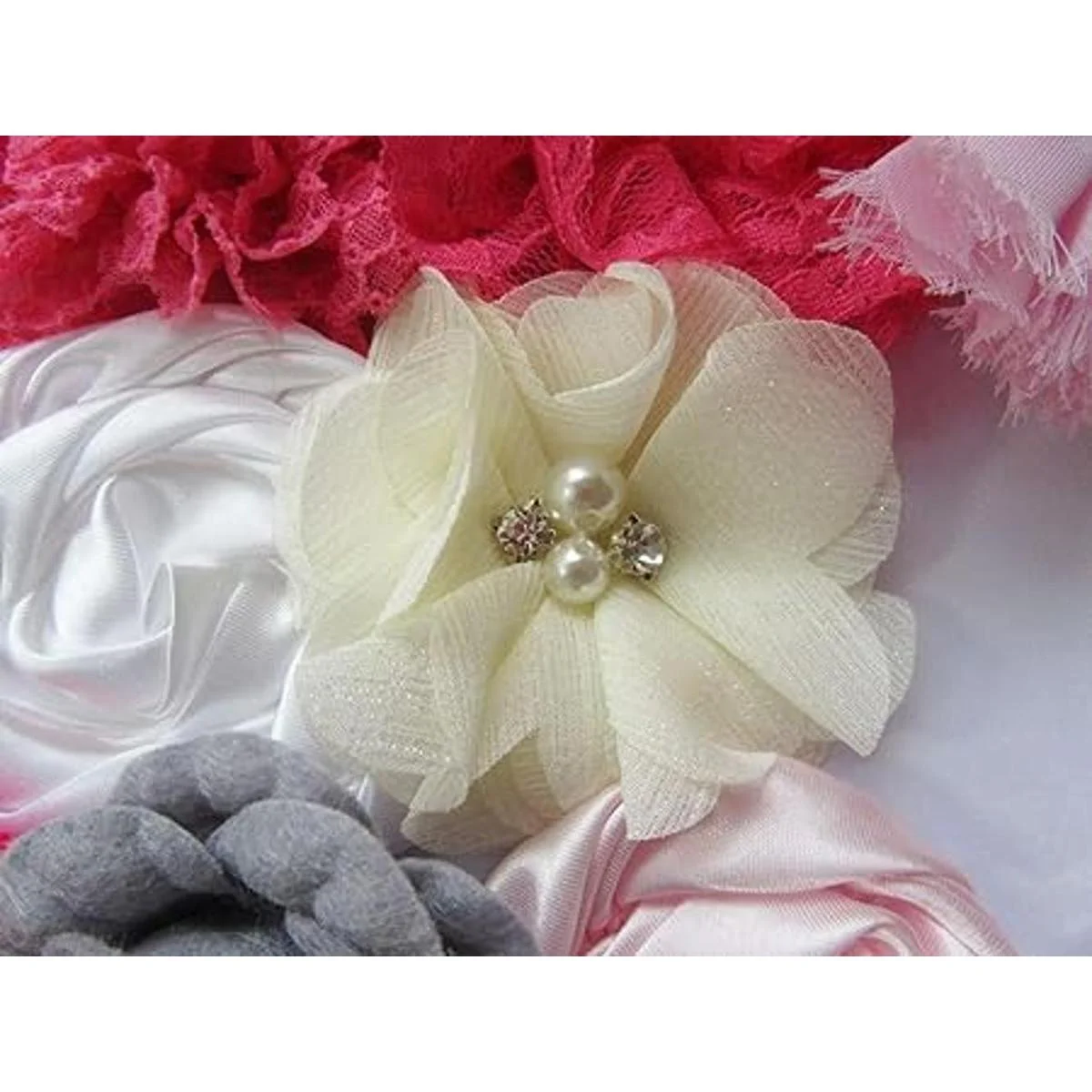 Flores de pelo hechas a mano de calidad flor de gasa, flor de encaje, flor de cinta de satén, flor de grogrén, flores de fieltro y otras flores hechas a mano. Ideal para diademas y kit de lazo.