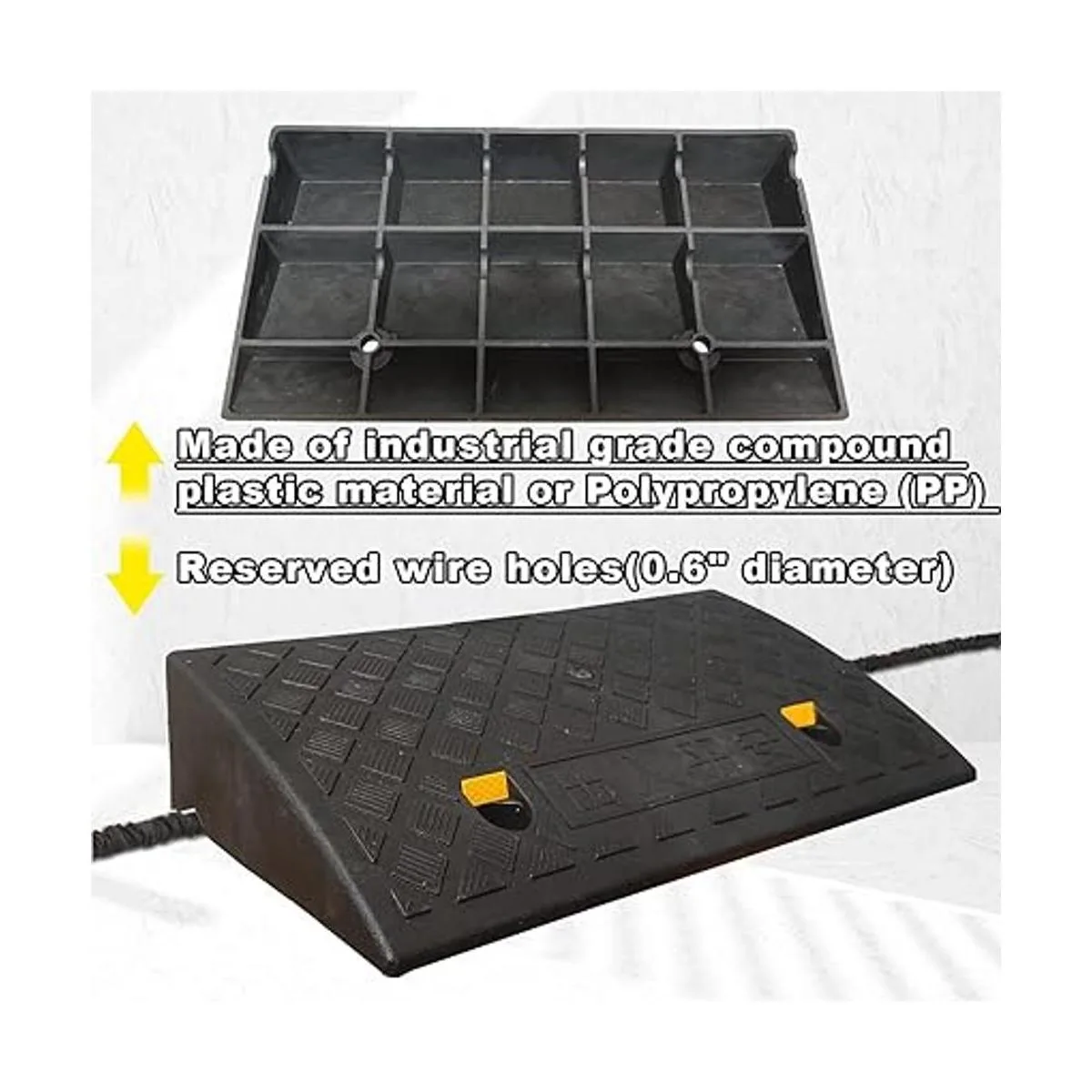 Rampa de bordillos resistente: nuestra rampa de bordillos está hecha de material plástico compuesto de grado industrial o polipropileno PP que es un tipo fuerte de material y está construida para durar. Cada barra de refuerzo no tiene menos de 0.2 pulgadas de grosor. No tienes que preocuparte por la fuerza de esta rampa de bordillo.