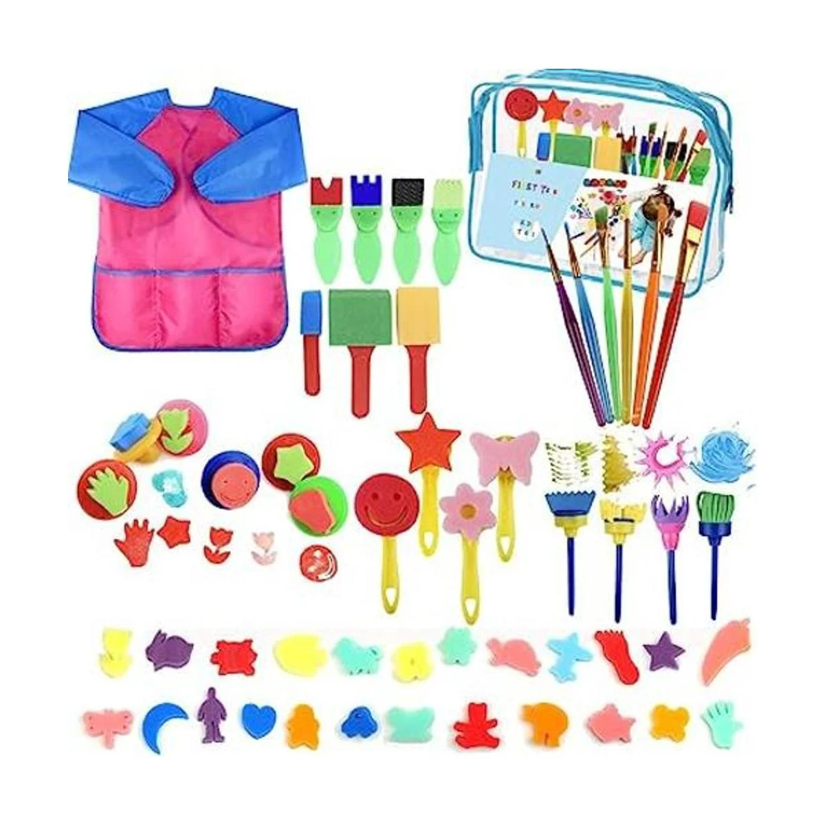 El paquete incluye: 51 pinceles de esponja y 1 delantal impermeable para niños