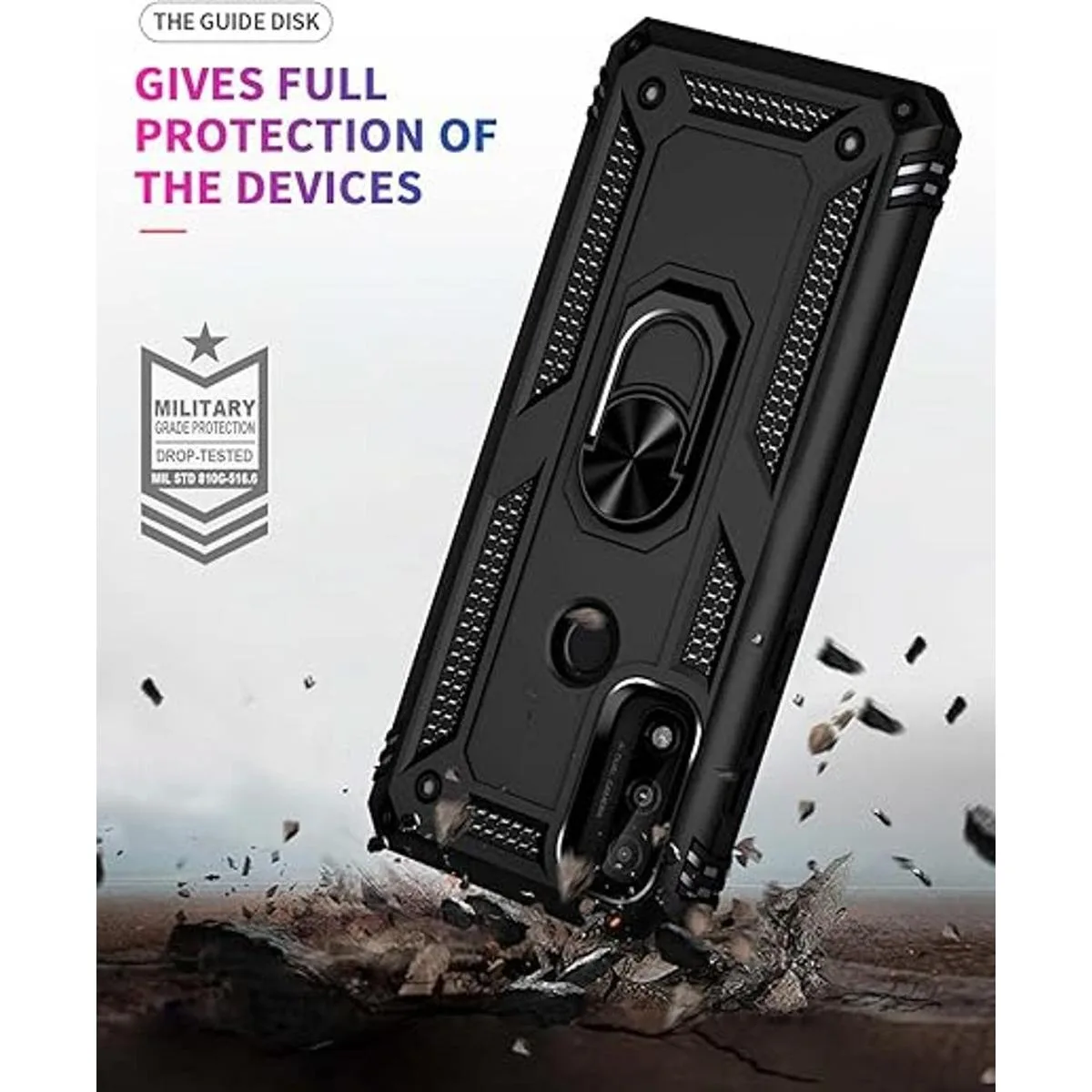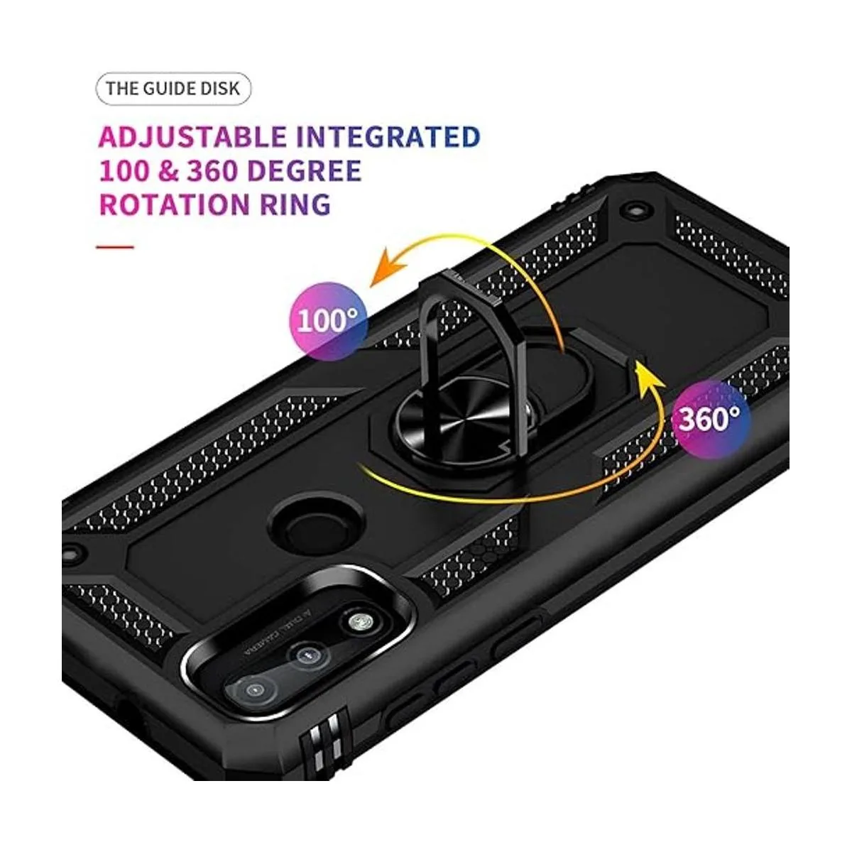 Soporte de anillo giratorio: el soporte de anillo de metal puede girar 360, fácil de girar y resistente en la funda. El soporte integrado te da la comodidad de ver videos y películas manos libres con la comodidad y estabilidad deseadas, además, la hoja magnética de metal integrada para una absorción estable, que se puede adsorber directamente al soporte magnético del coche.