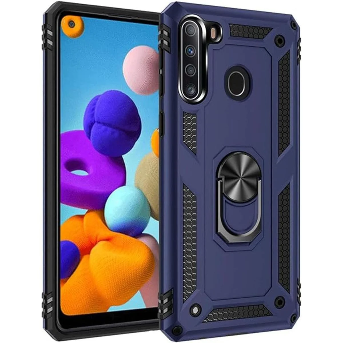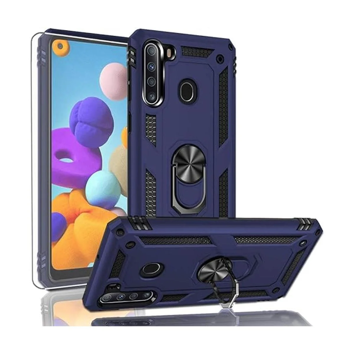 YZOK Funda para Galaxy A21, funda para Samsung A21, con protector de pantalla HD, grado militar anillo de montaje para automóvil, soporte híbrido, policarbonato duro suave, TPU a prueba de golpes, funda protectora para Samsung Galaxy A21 azul