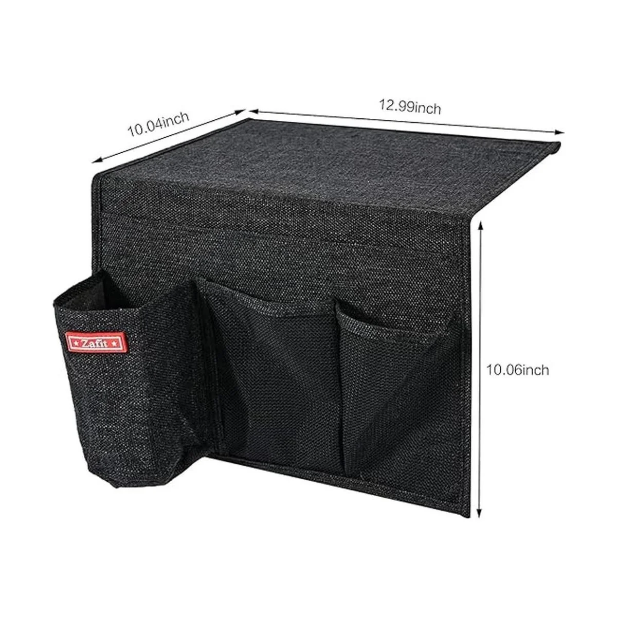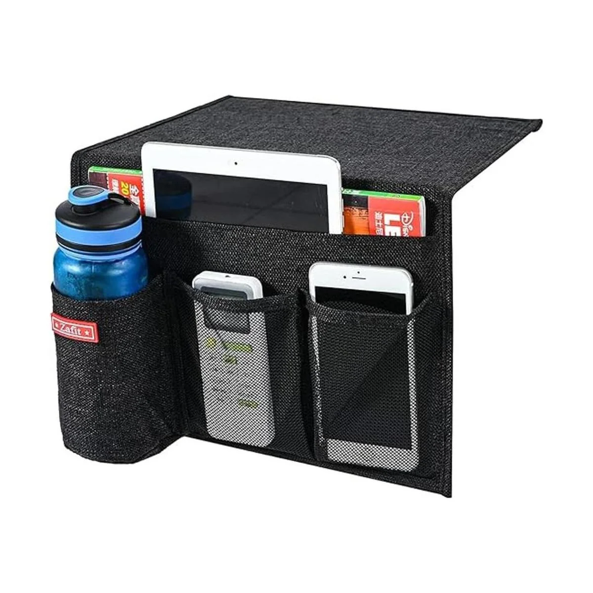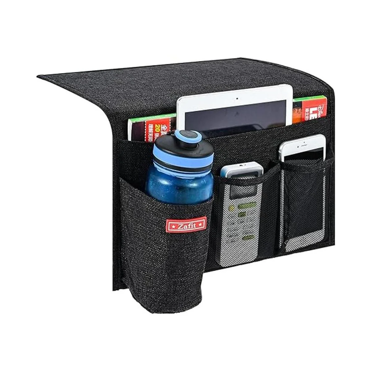 Zafit Organizador de noche de lino de 4 bolsillos, organizador de almacenamiento de noche con soporte para botella de agua para revistas, controles remotos, teléfono negro