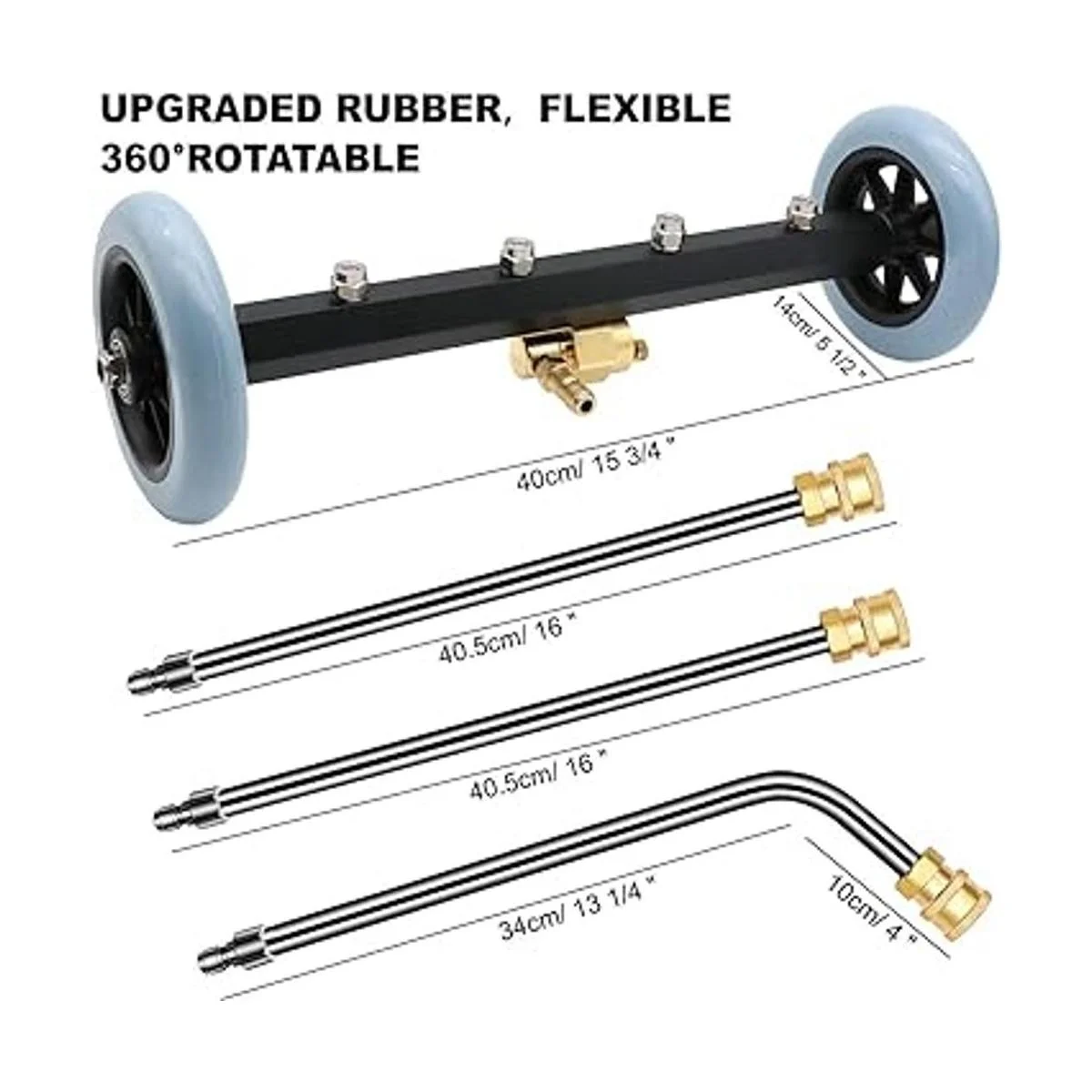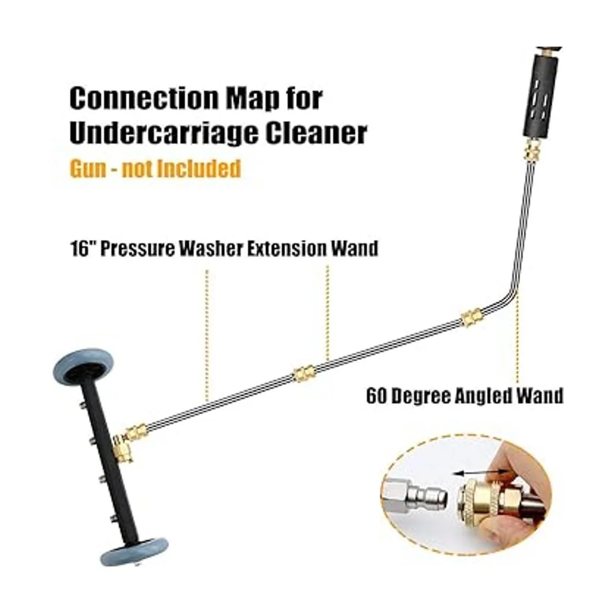 El paquete incluye: 2 funciones en 1 limpiador de tren de rodaje para lavadora a presión longitud: 15 3/4 pulgadas, 1 varita angular de 60 grados longitud de 17 1/4 pulgadas y 2 varillas de extensión de lavadora a presión de 16 pulgadas. Todas las piezas tienen conexión rápida de 1/4 pulgadas.