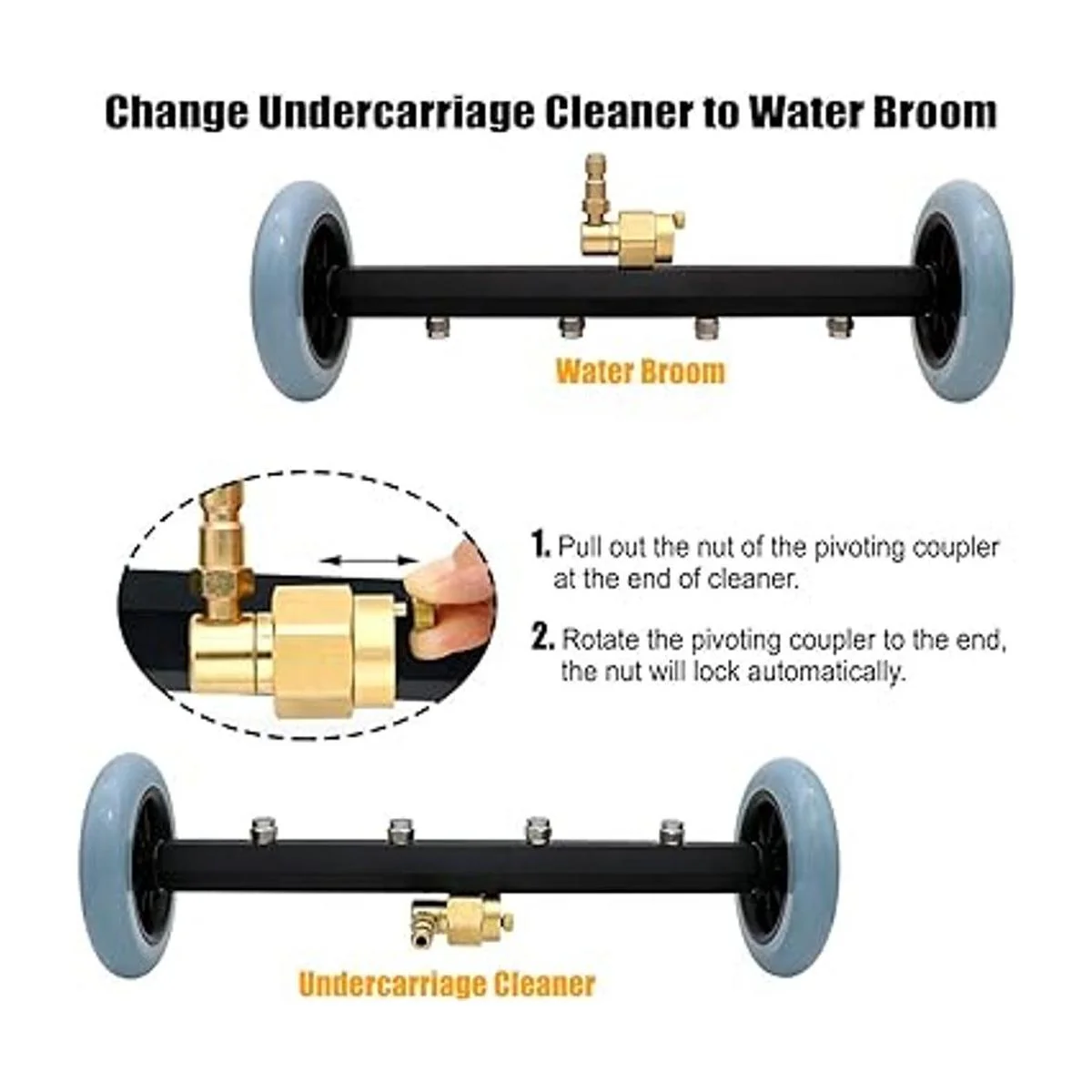 Modo fácil de cambiar: tira de la tuerca del acoplador pivotante al final del limpiador. Luego gira el acoplador pivotante hasta el extremo, y la tuerca se bloqueará automáticamente.