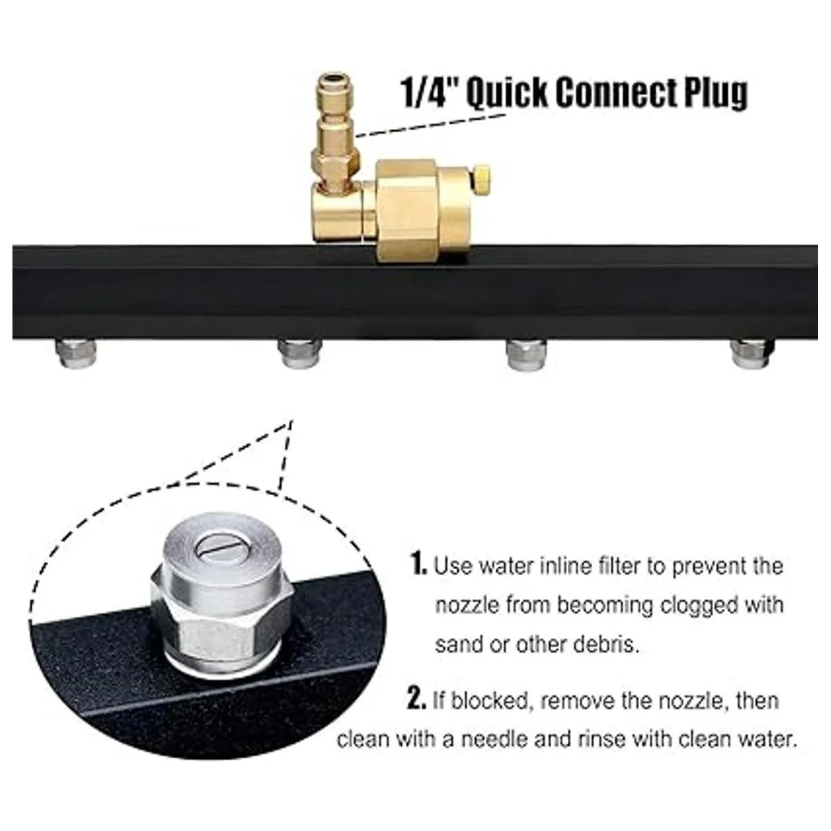 Atención: el rango de presión es de 1500 PSI a 4000 PSI. Asegúrate de que tu lavadora a presión de trabajo sea superior a 1500 PSI. 2500 PSI o más tendrán un mejor resultado. Nota: no es compatible con manguera de jardín, manguera de agua o grifo directamente.