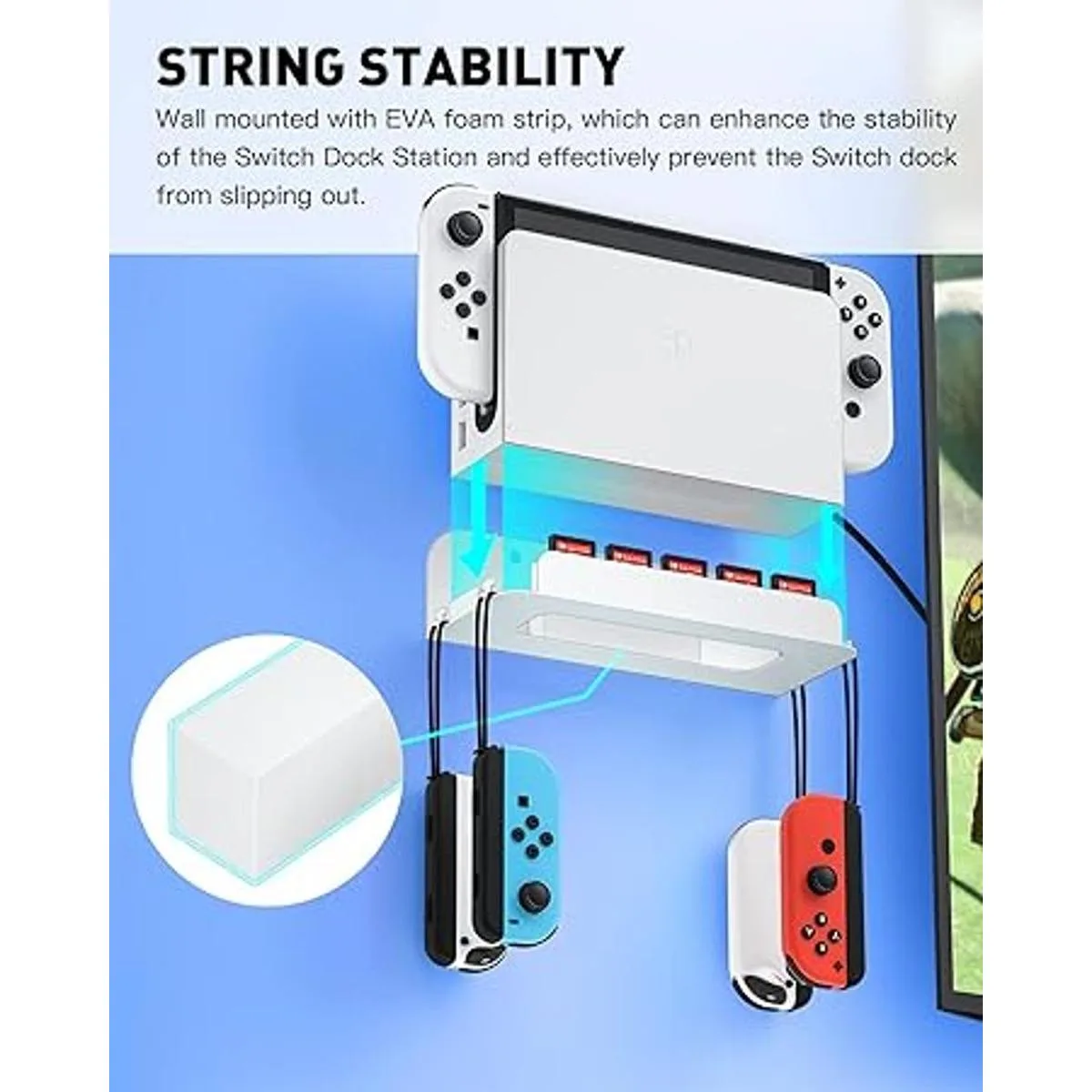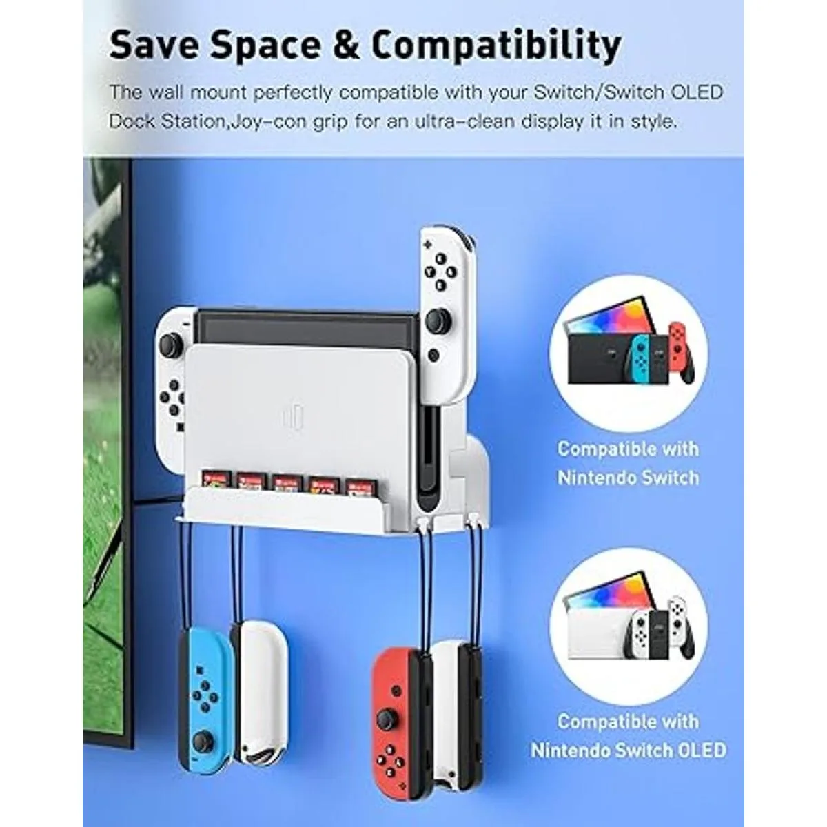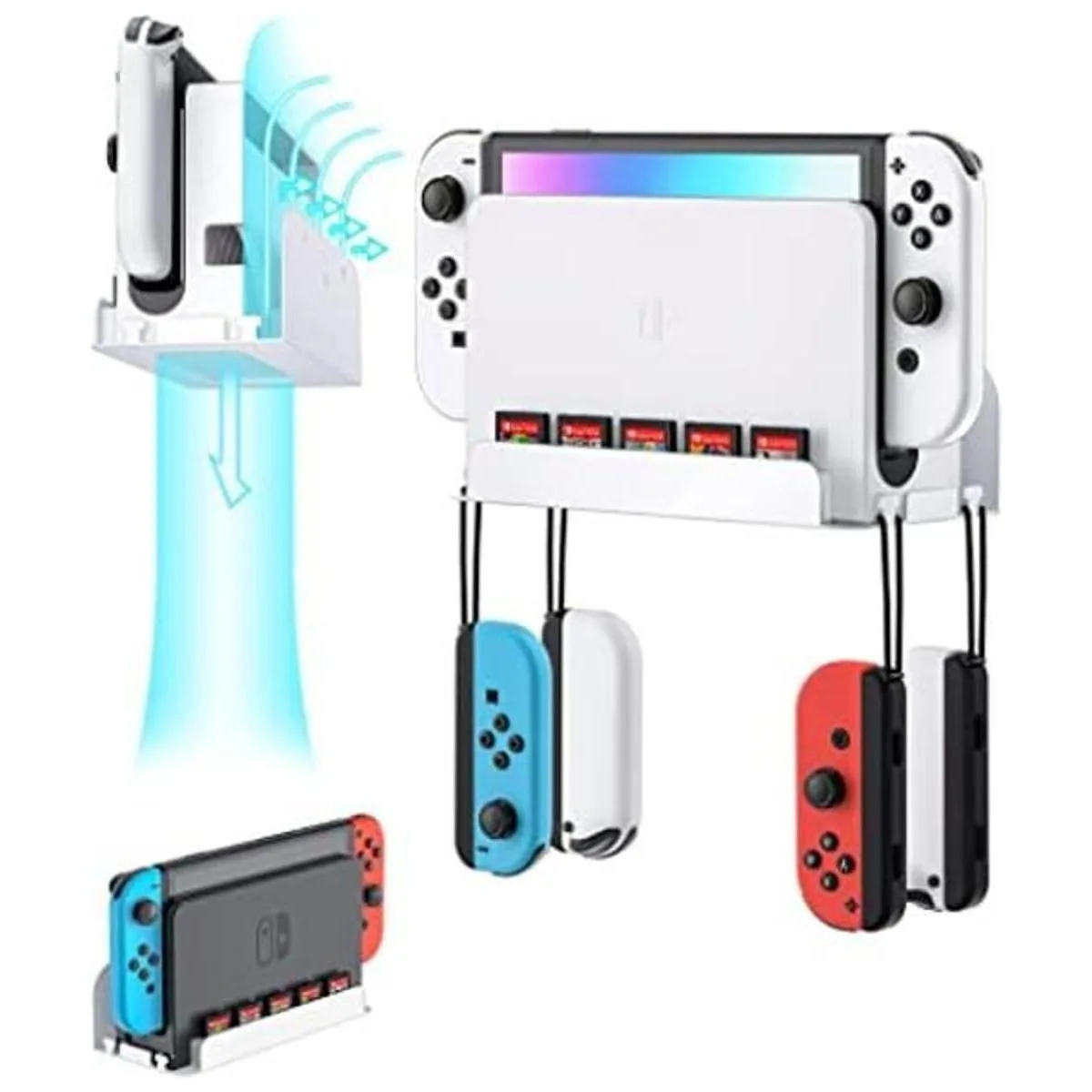 ZAONOOL Soporte de pared para interruptor e interruptor OLED, soporte de pared con 5 ranuras para tarjetas de juego y 4 ganchos Joy Con, almacena de forma segura tu consola Switch cerca o detrás de la televisión blanco
