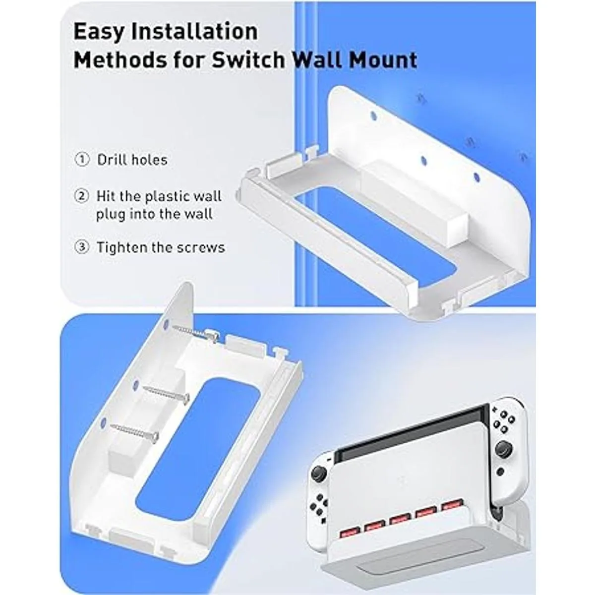 Diseñado para Nintendo Switch/Switch OLED: si eres un amante del juego Switch, este soporte de pared Switch es un accesorio esencial en tu hogar. Este soporte de pared para interruptor es compatible con Switch/Switch OLED. Y no bloquea todos los puertos de la base del interruptor, puedes instalar este soporte de pared Switch cerca o junto al televisor para proporcionarte la mejor experiencia de juego en la pantalla grande.