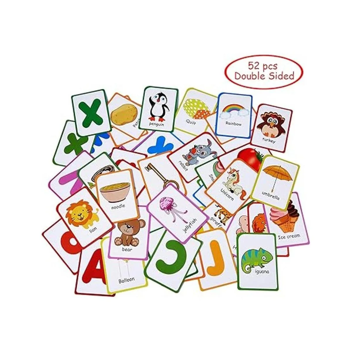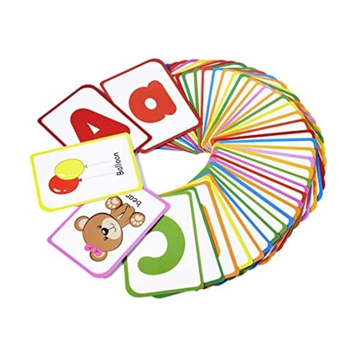 52 tarjetas flash de doble cara: material de cartón grueso y duradero con laminado de dos lados. Letras ABC impresas en un lado 26 mayúsculas y 26 minúsculas. El otro lado imprime los objetos correspondientes imágenes con palabras: A para manzana, a para hormigas; B para globo, b para oso, etc.