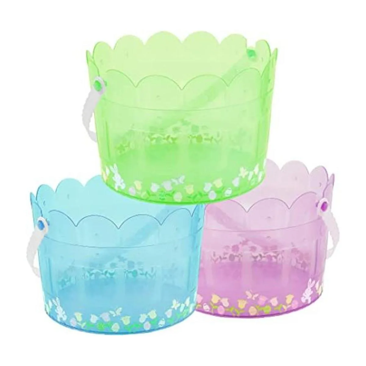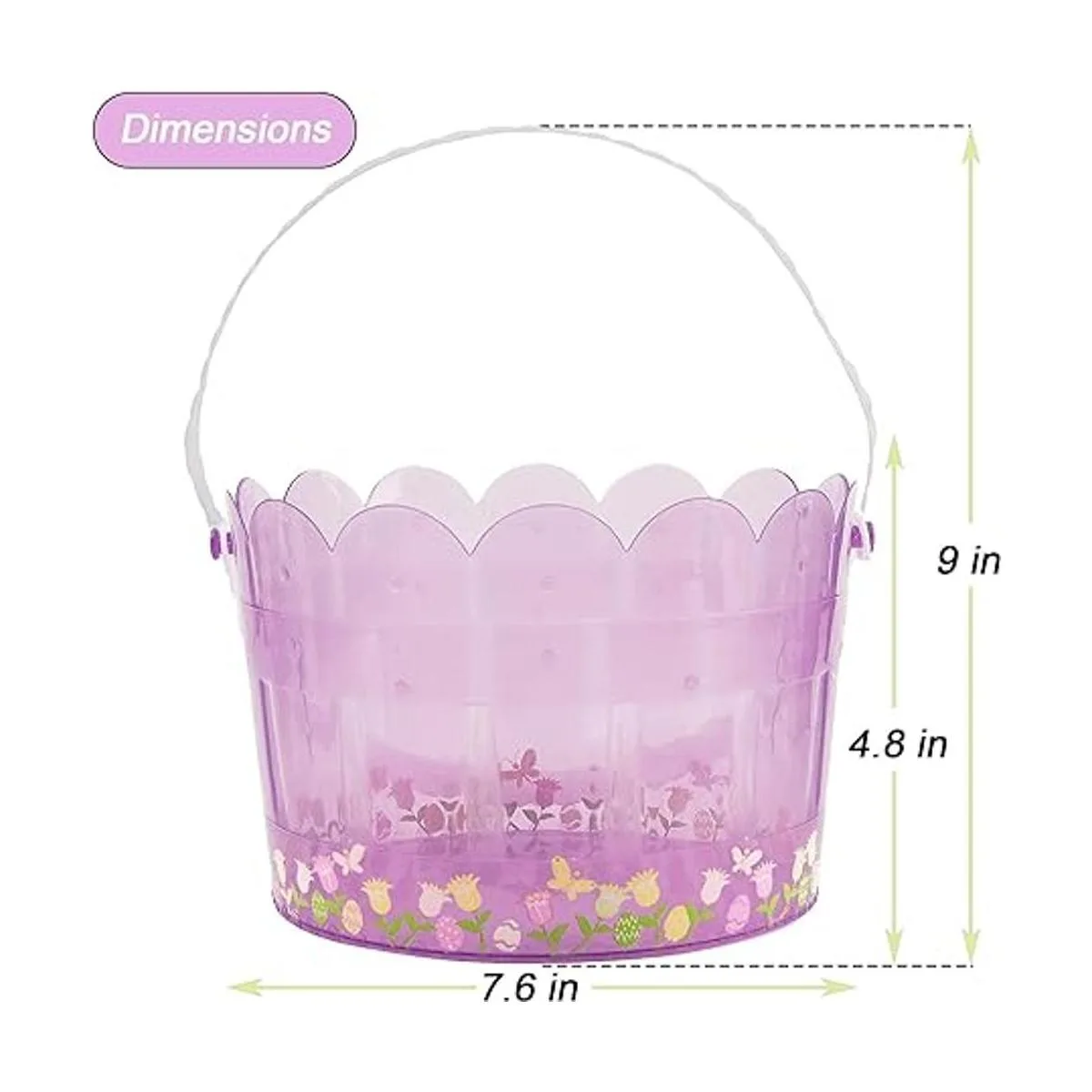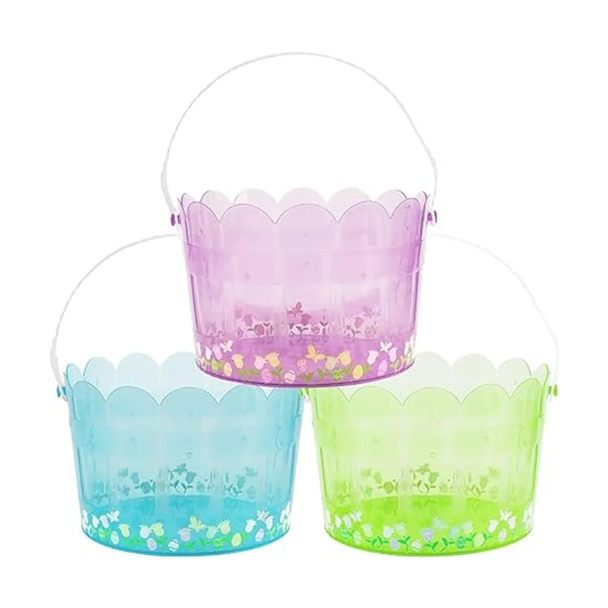 Juego de cubos de Pascua: incluye 3 cubos en 3 colores diferentes: verde, azul y morado. Cada uno tiene un tamaño de 7.6 pulgadas de diámetro y 4.8 pulgadas de altura con mango de 4.2 pulgadas de alto. Hecho de material plástico de alta calidad, seguro, duradero y lavable.