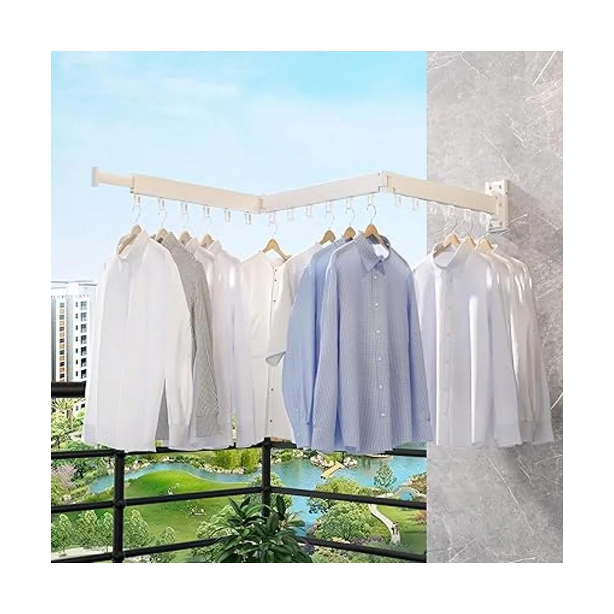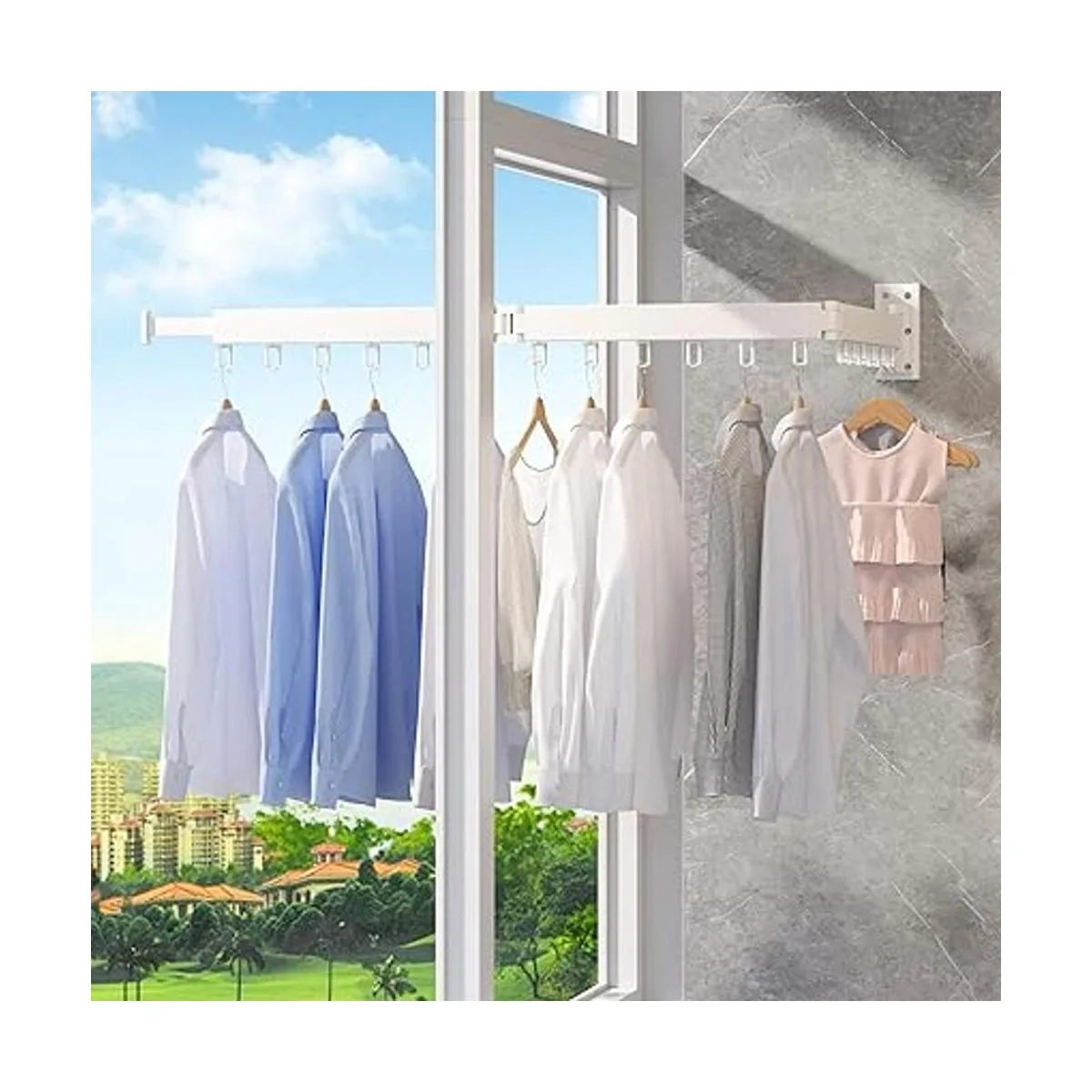 Muchos escenarios de aplicación Puedes poner este tendedero en tu balcón, baño, lavandería o junto a la ventana de tu dormitorio. Si quieres dejar que tu ropa se seque con más sol, puedes girar el perchero. Seca la ropa por la ventana