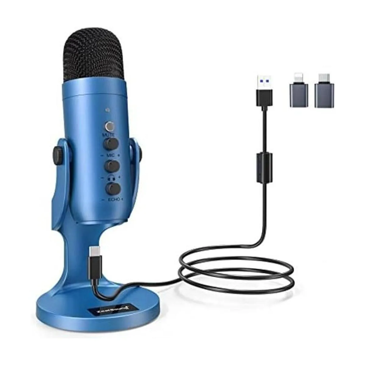 ZealSound Micrófono USB, micrófono condensador de juegos para PC, laptop, teléfono, PS45computadora, adaptador Lightning y tipo C incluyen, perilla de ganancia de micrófono, silencio LED, monitor, para transmisión, podcast, grabación de estudio, azul