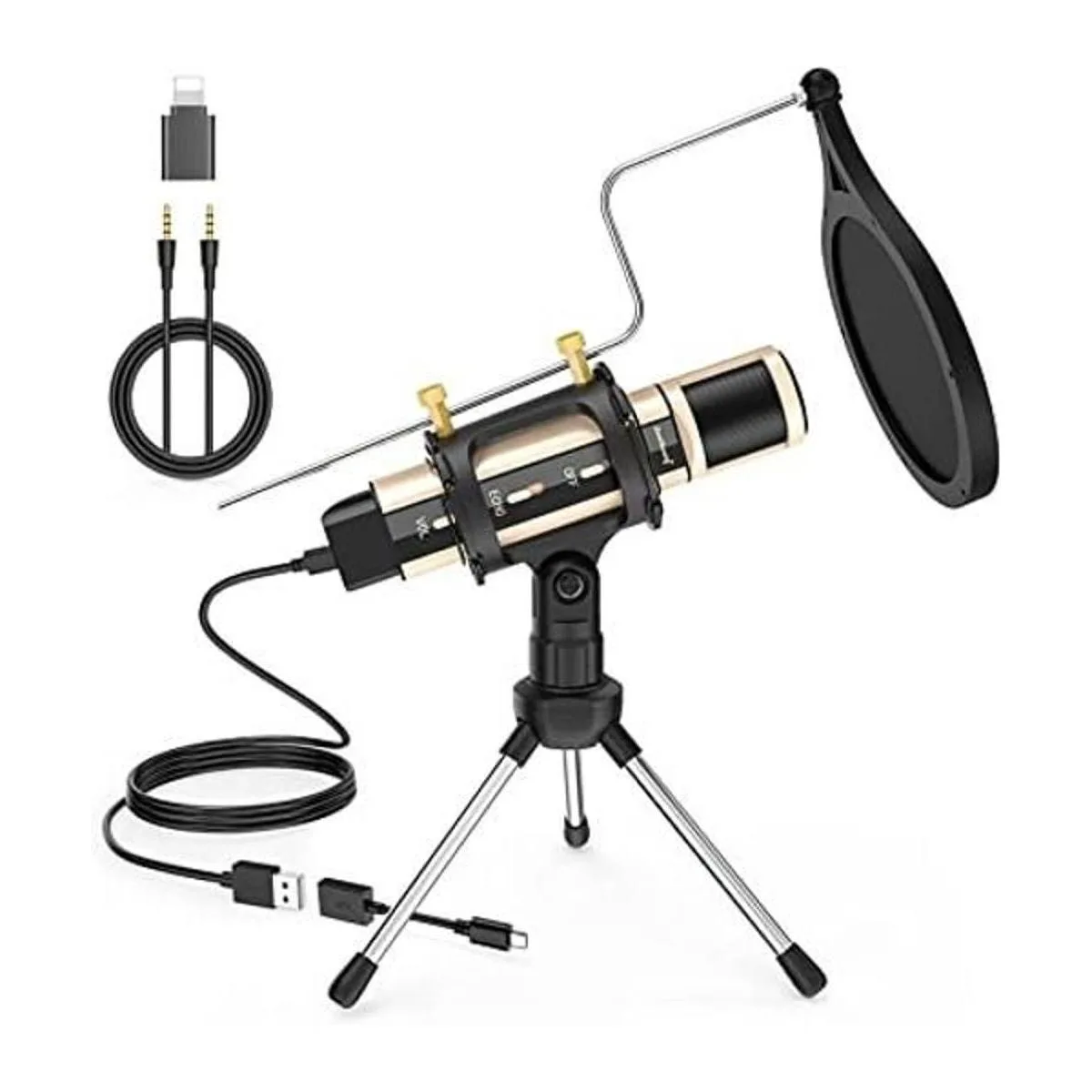 Dont Worry to Spend More on Accessories 1 x Sturdy and durable, studiograde streaming metal construction microphone; 1 x Sturdy Steel Shock Mount Stand; 1 x dual layer Pop Filter; 1 x 70.87 USB Cable Function 1: Charging cable; Function 2: Audio cable when using with USB port of Computer; 1 x 31.5 inch 3.5mm Audio Cable for Phones and Tablet; 1 x Lightning Adapter for the Apple iPhone products; 1 x Type C Adapter for the Newest MacBook and all other Type C devices Phone, tablets and PC; 1 x User manual and free Technical Support.