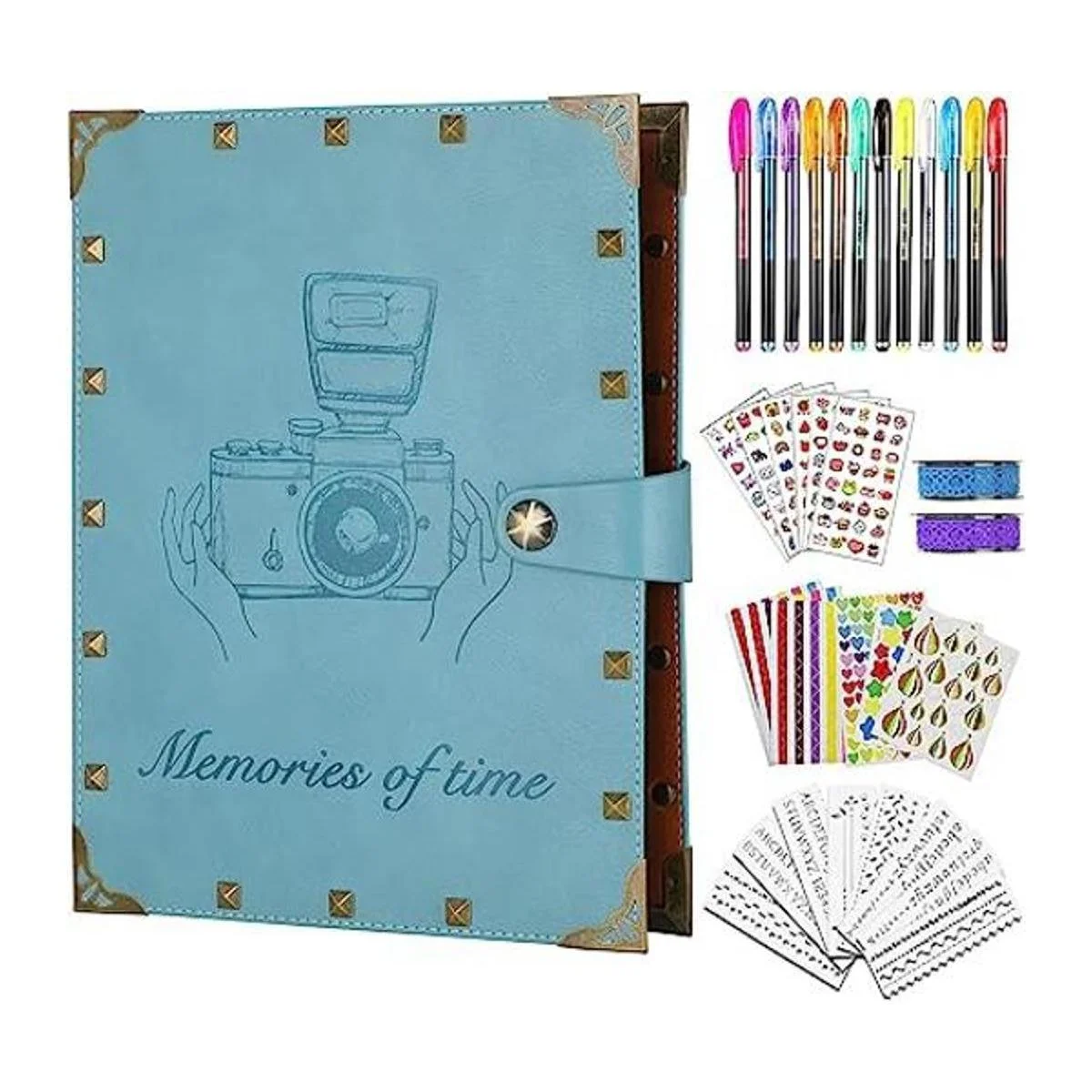 Kit de suministros para álbumes de recortes: viene con 8 plantillas de dibujo de bricolaje, 12 marcadores metálicos, 6 calcomanías de dibujos animados, 3 bonitas calcomanías, 3 calcomanías de esquina de fotos, 2 cintas de encaje. Funda de piel sintética de alta calidad, con diseño de patrón en relieve que aporta un tacto verdadero, no solo impreso
