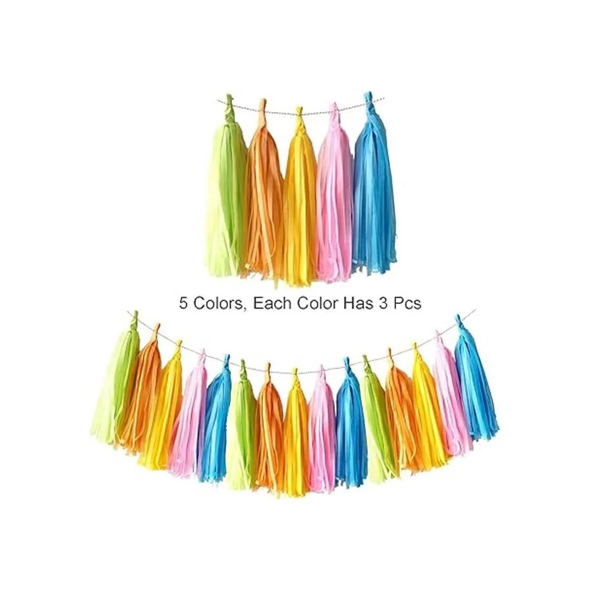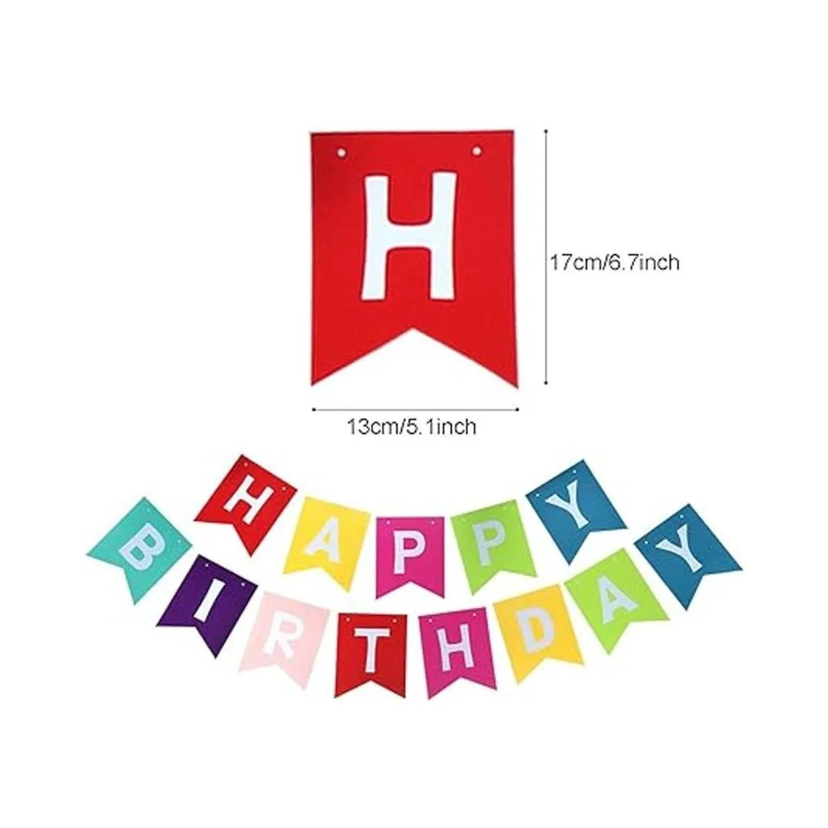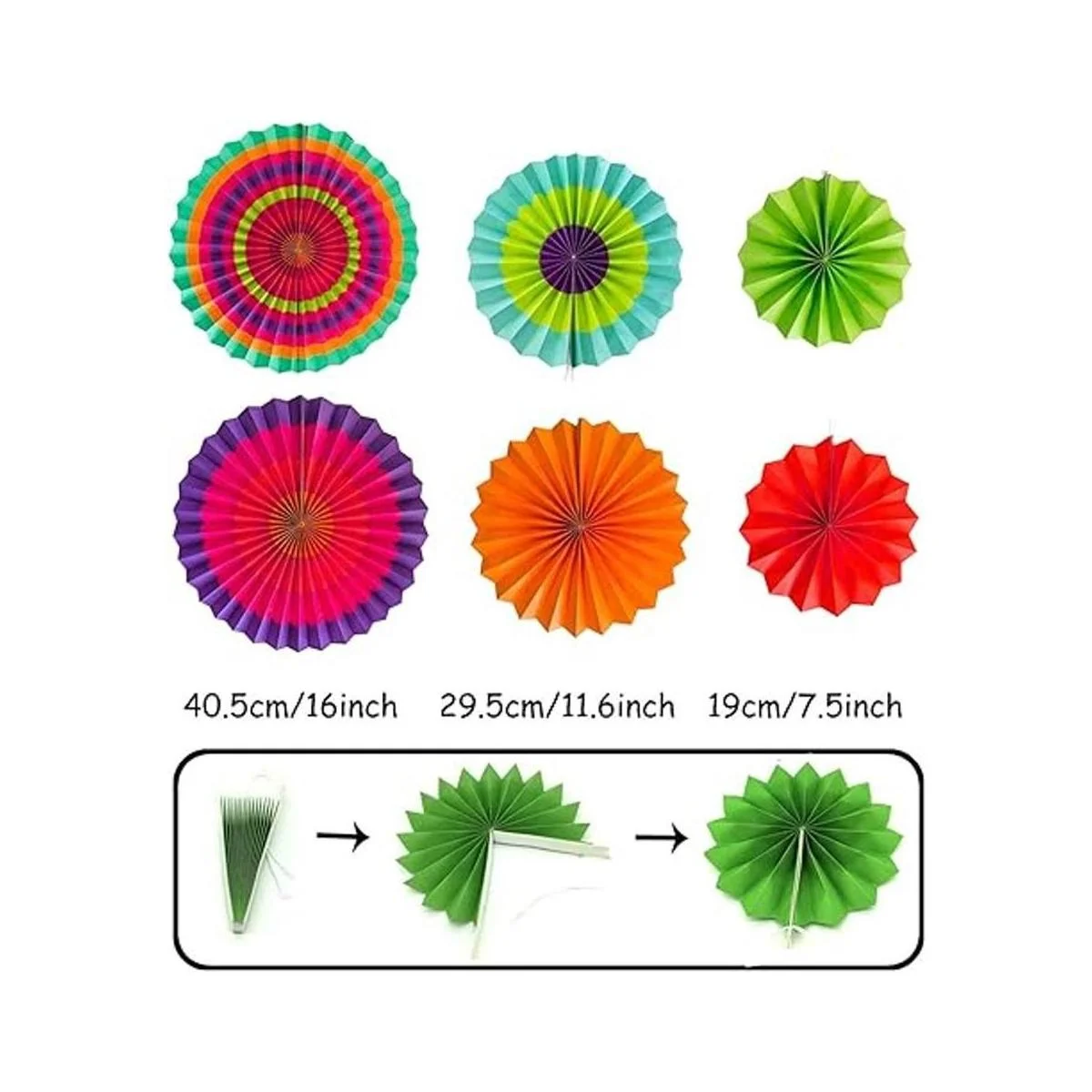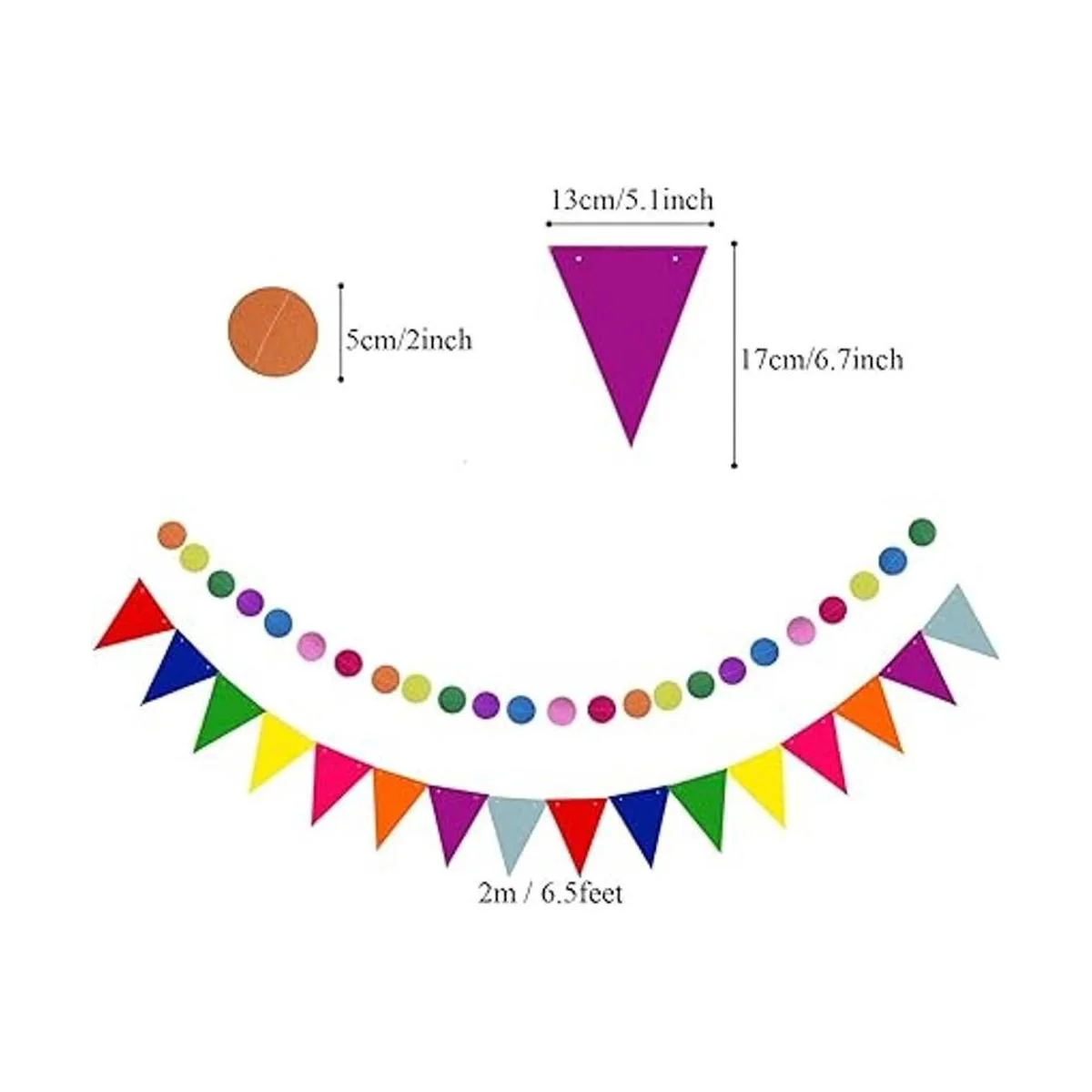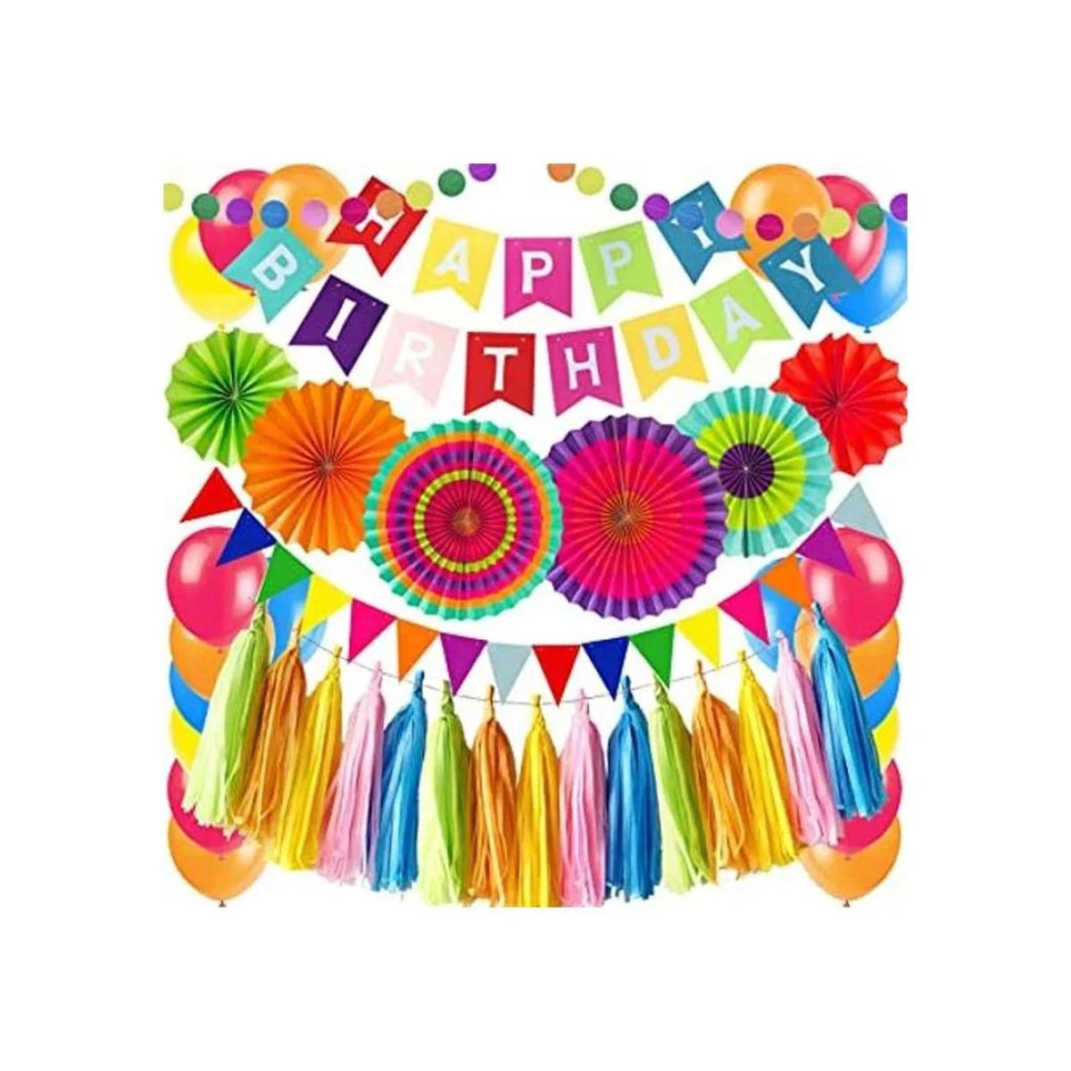 44Pcs Decorations Kit: 1 x HAPPY BIRTHDAY banner, 1 x 6.5ft Triangular pennants, 6 x 10inch/25cm Paper fans, 15 x Paper Tassel, 1 x 6.5ft Circle Paper Garland, 20 x Party Balloons. Color: MultiColored