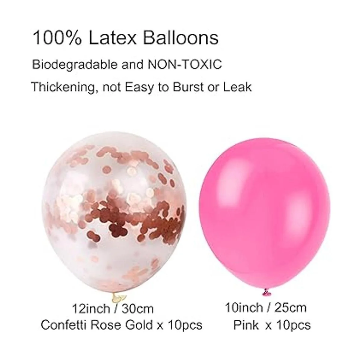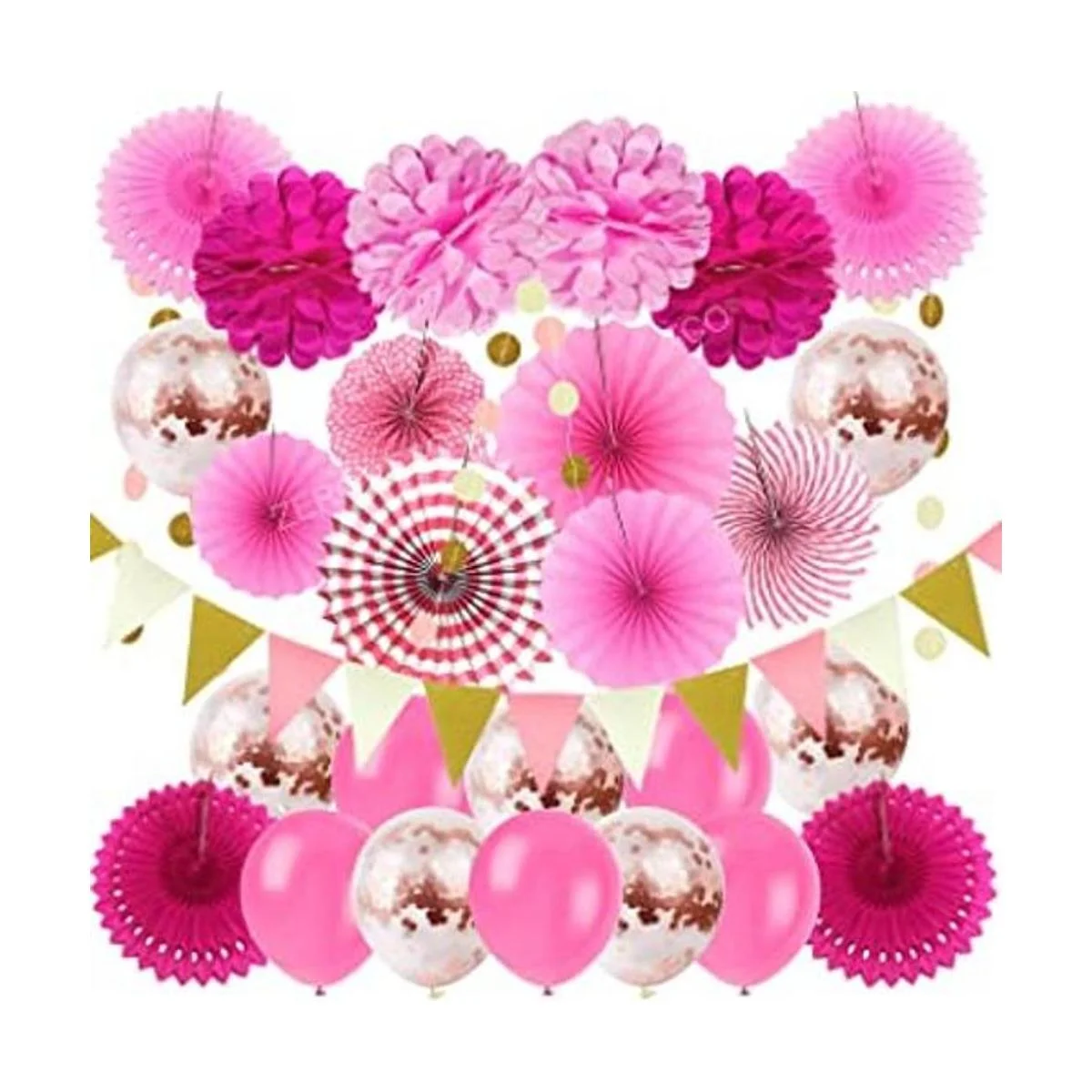 Kit de decoración para fiestas: 10 globos de confeti rosa, 10 globos de látex rosa, 1 banderines triangulares de 6.5 pies, 4 pompones de papel de panal de abeja de 9.8 in, 6 abanicos de papel de 9.8 in, 4 abanicos huecos de papel, 1 guirnalda de papel circular. Color: rojo rosa y rosa intenso