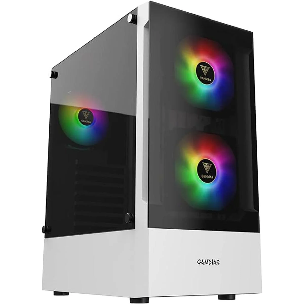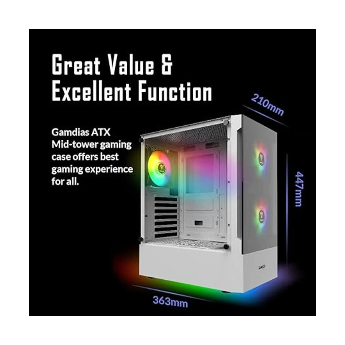 ZEUS GAMDIAS Caja blanca para computadora RGB ATX de media torre con panel lateral de vidrio templado y un filtro magnético de polvo y 3 ventiladores ARGB integrados de 4.724 in