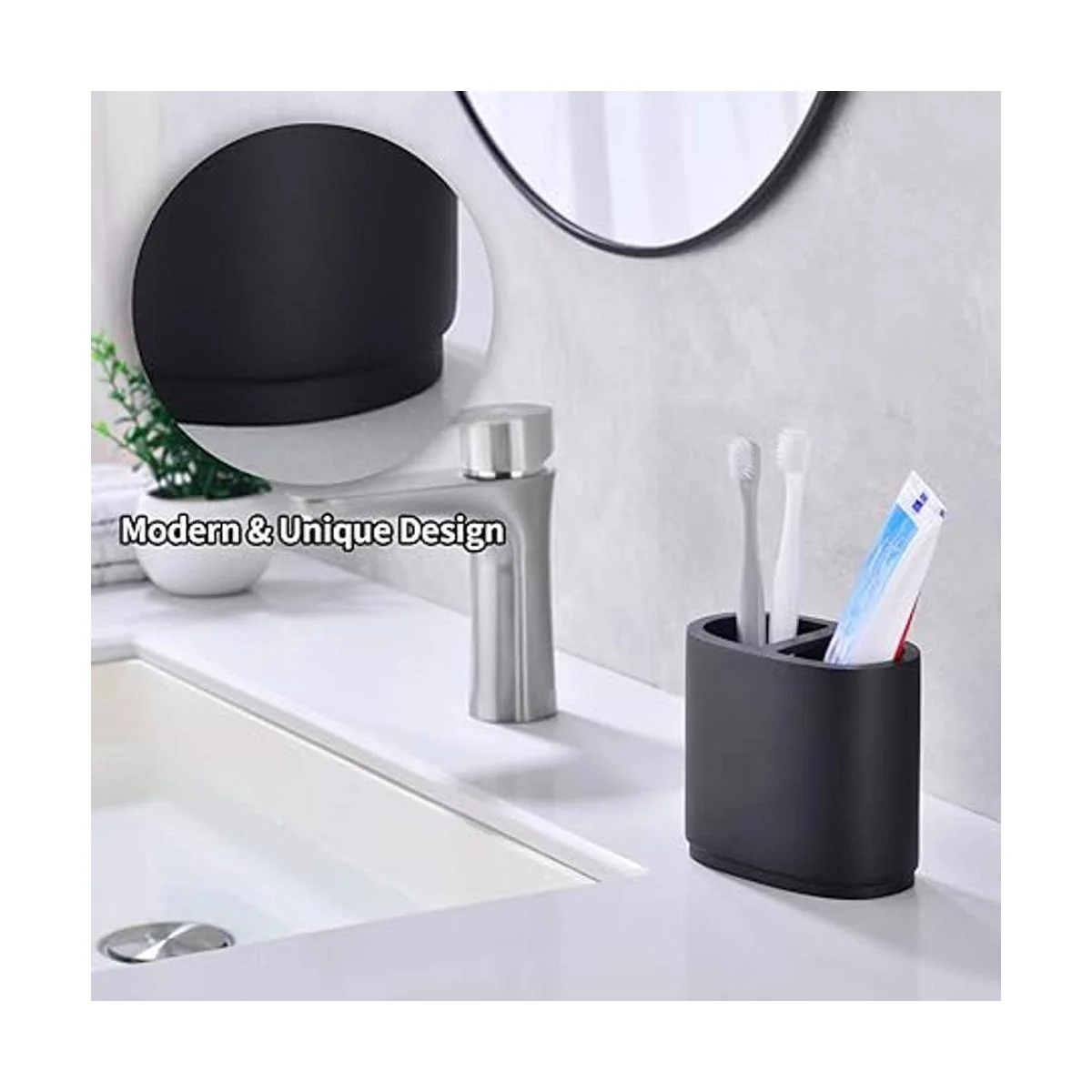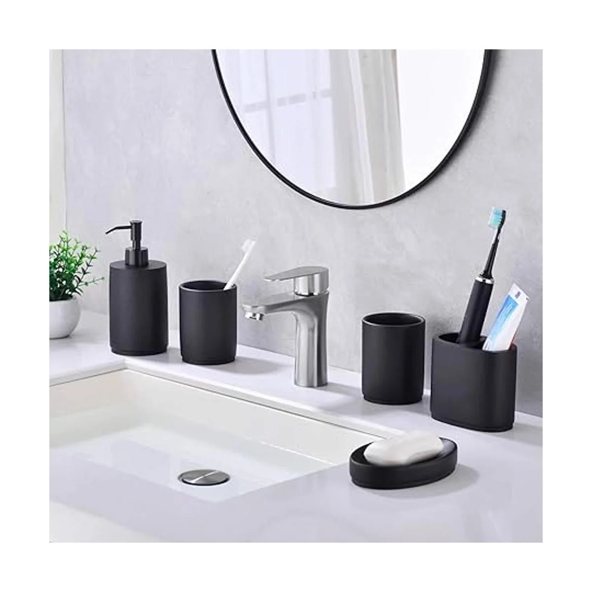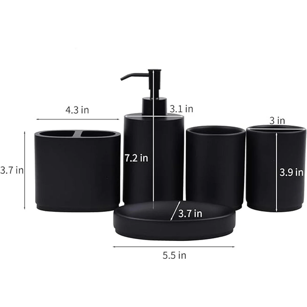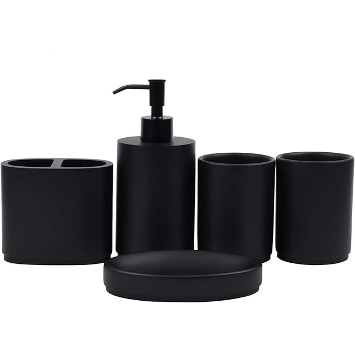 ZEXZEN Juego de accesorios de baño, 5 piezas, juego de baño negro mate, accesorios con dispensador de jabón, soporte para cepillo de dientes, jabonera, vaso de vaso, juego de regalo de baño de resina negro mate
