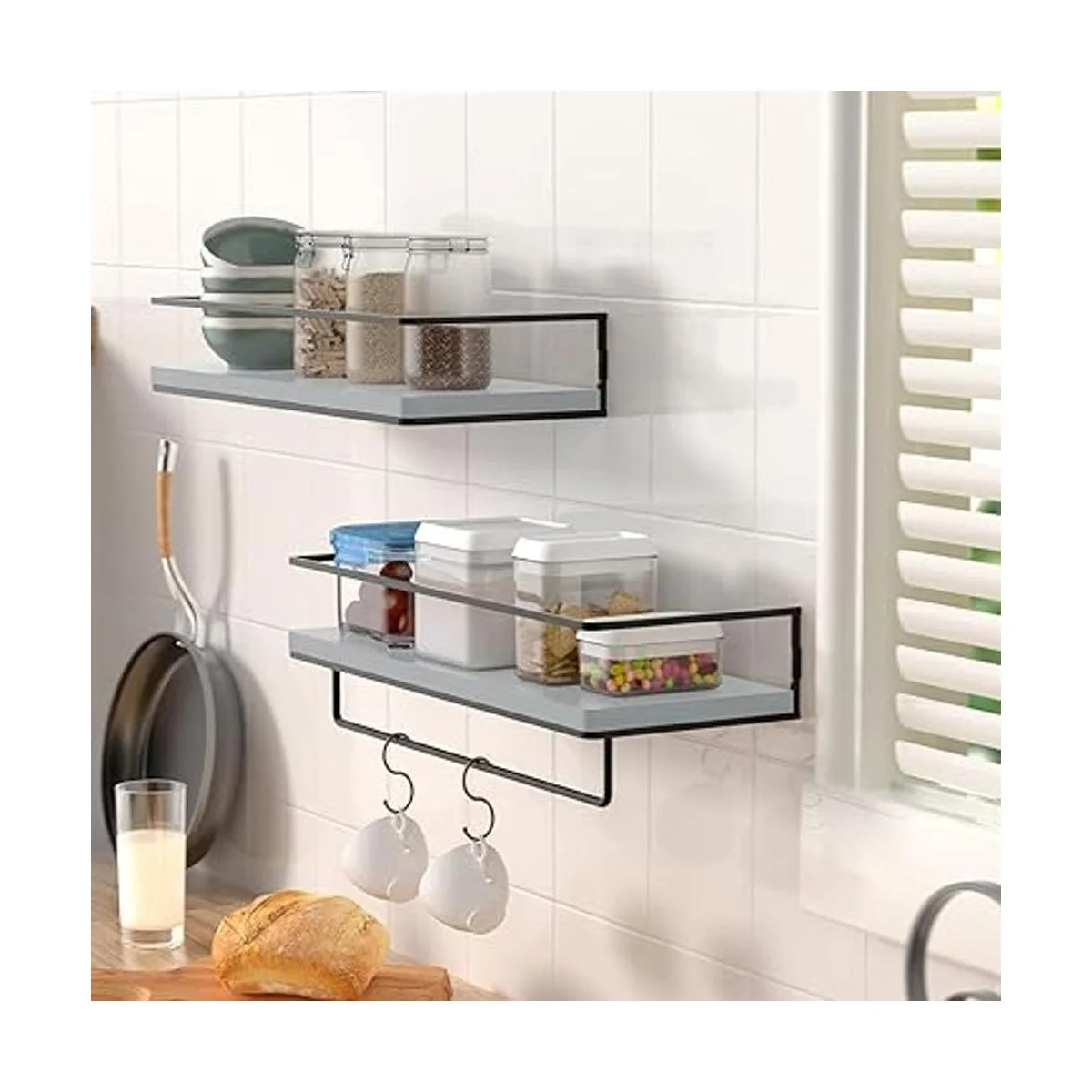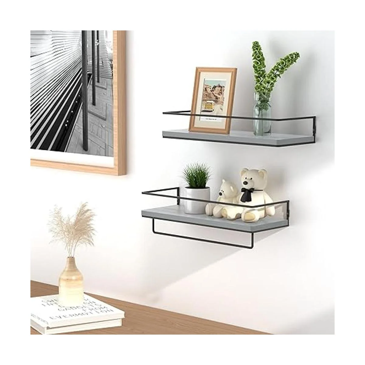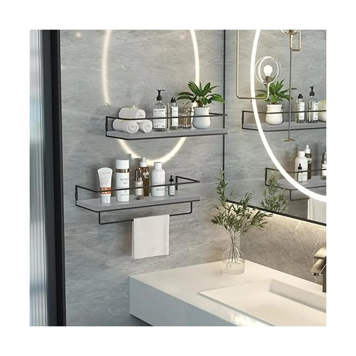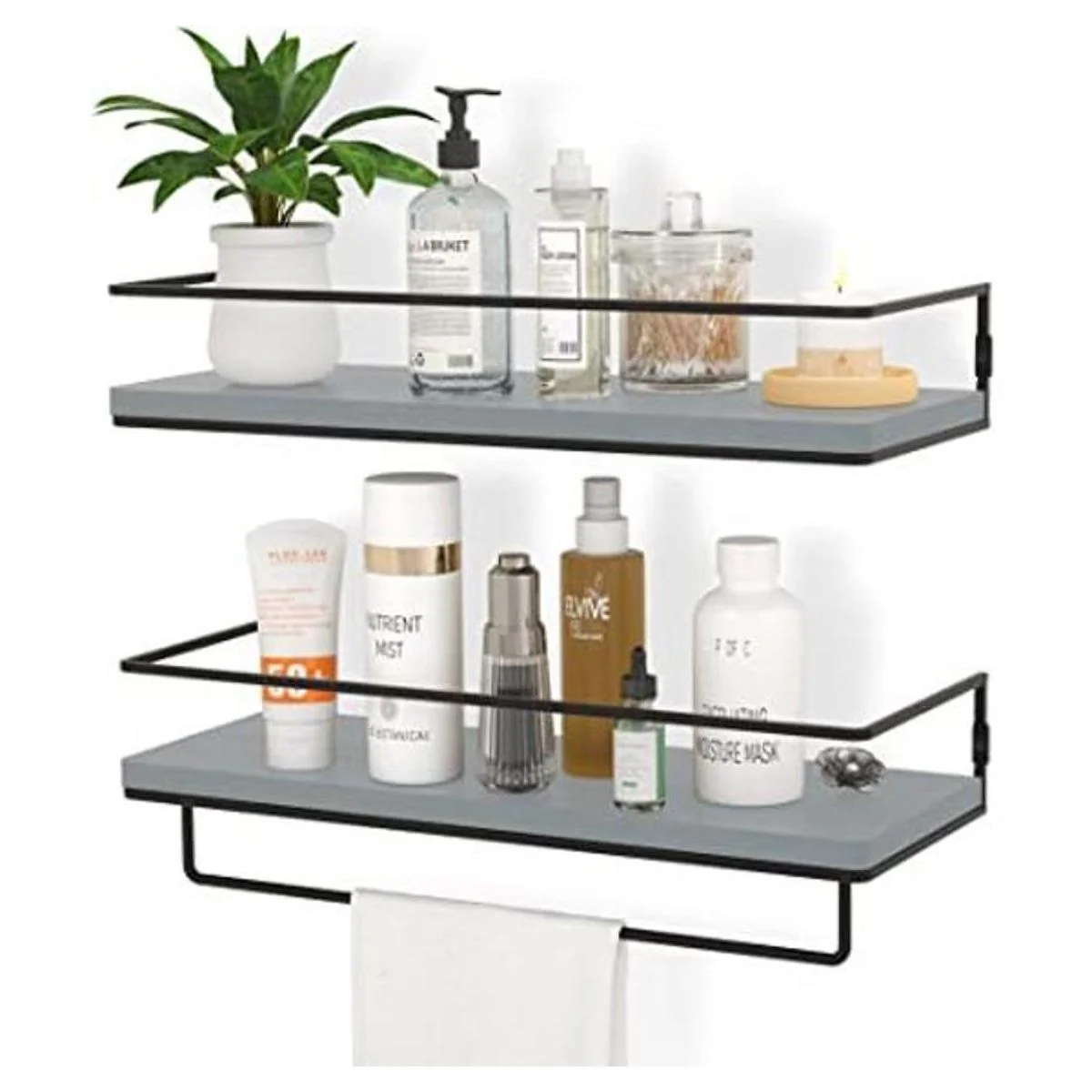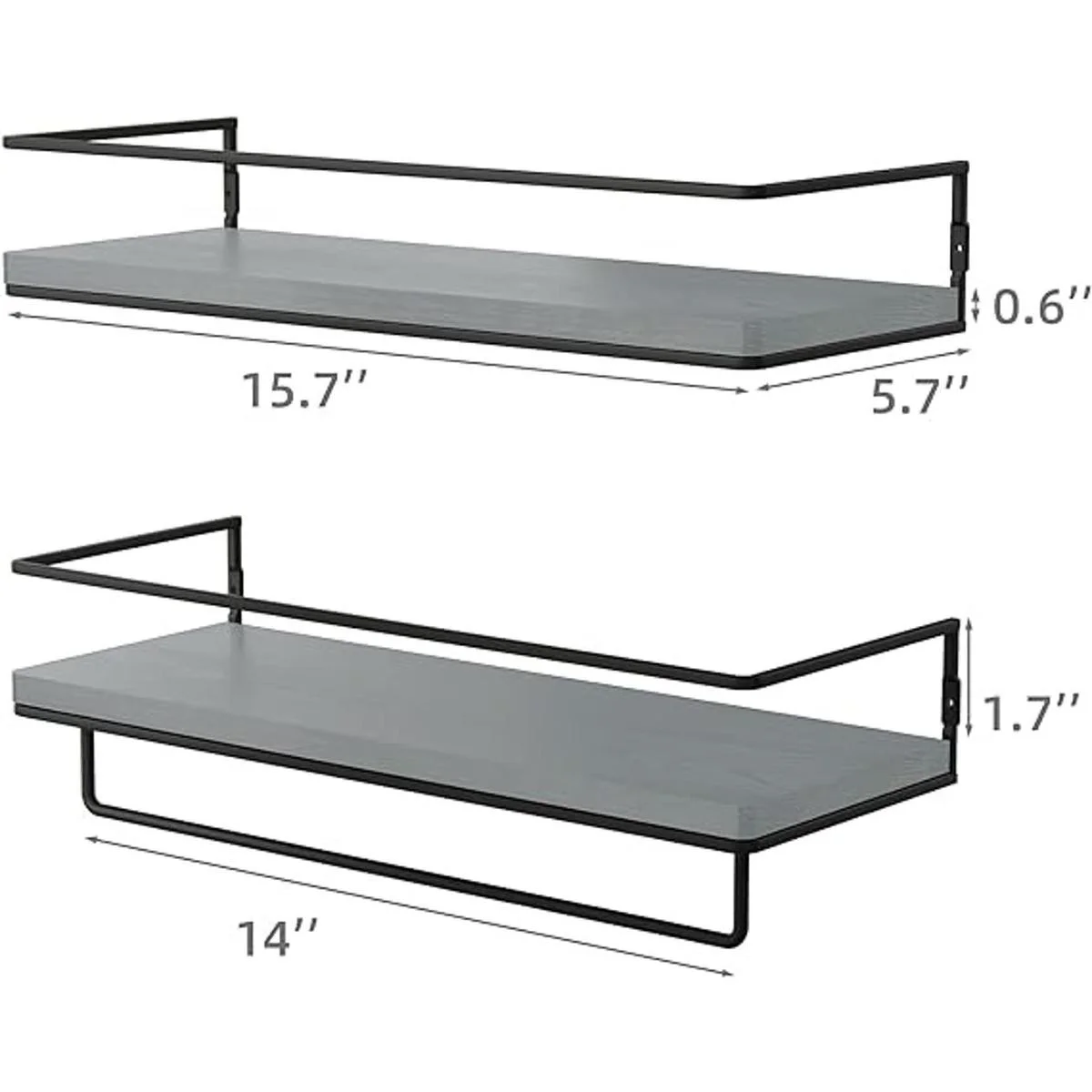ZGO Juego de 2 estantes flotantes para pared, estantes de almacenamiento montados en la pared con marco de metal y toallero para baño, cocina, dormitorio gris, gris