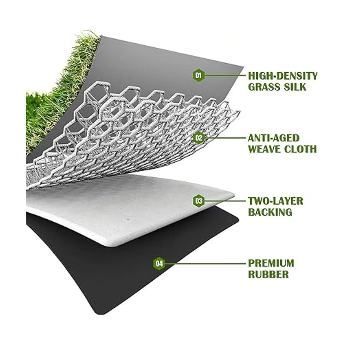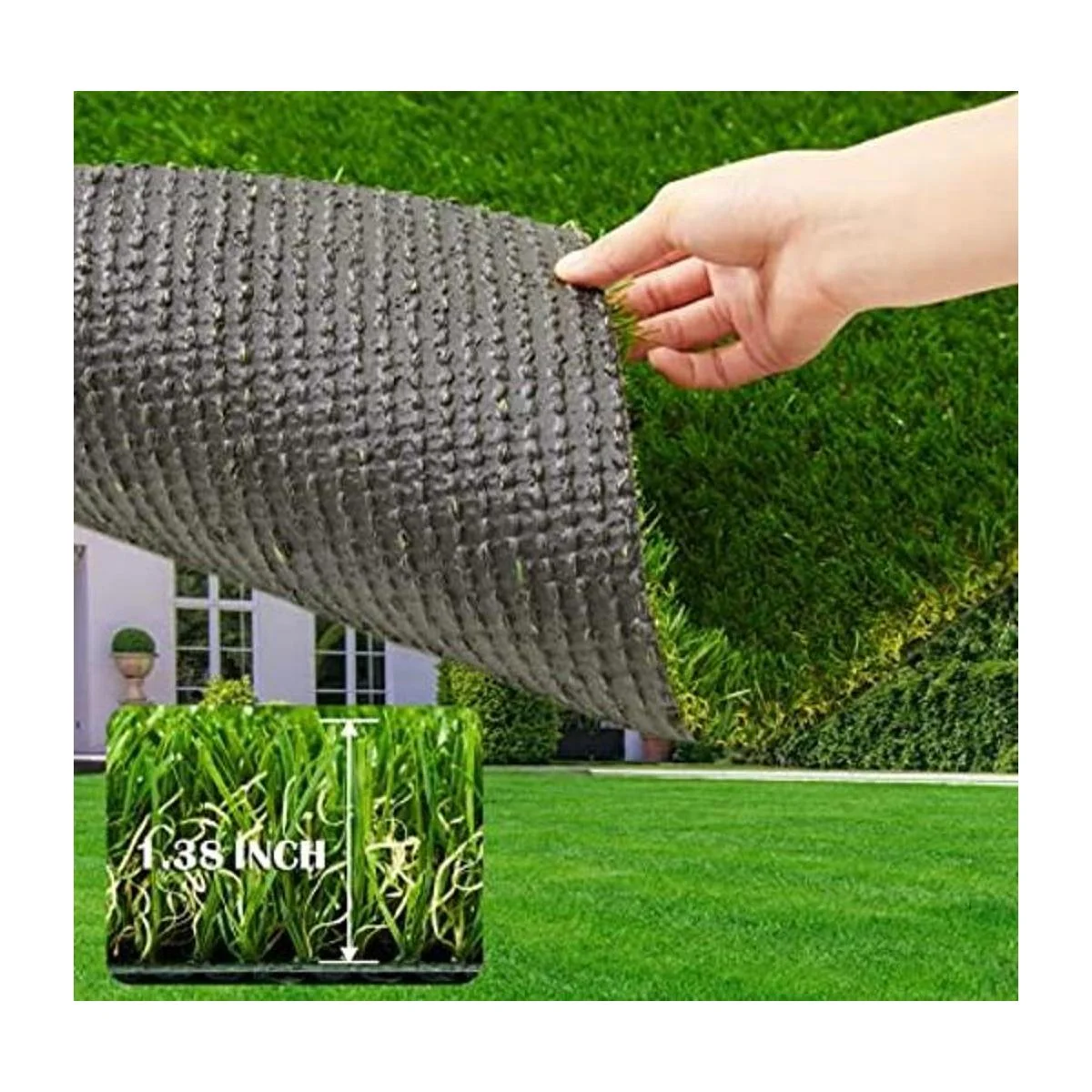 Césped artificial resistente hecho de hilo de polietileno que tiene un tacto cómodo. Su parte trasera de dos capas es de tela tejida antienvejecimiento de polipropileno, diseñada con agujeros de drenaje para un fácil drenaje del agua. El revestimiento detrás está hecho de látex de goma de estireno butadieno. Altura de la hierba: 1.38 pulgadas, 75 oz/yarda cuadrada.