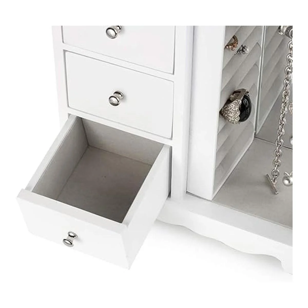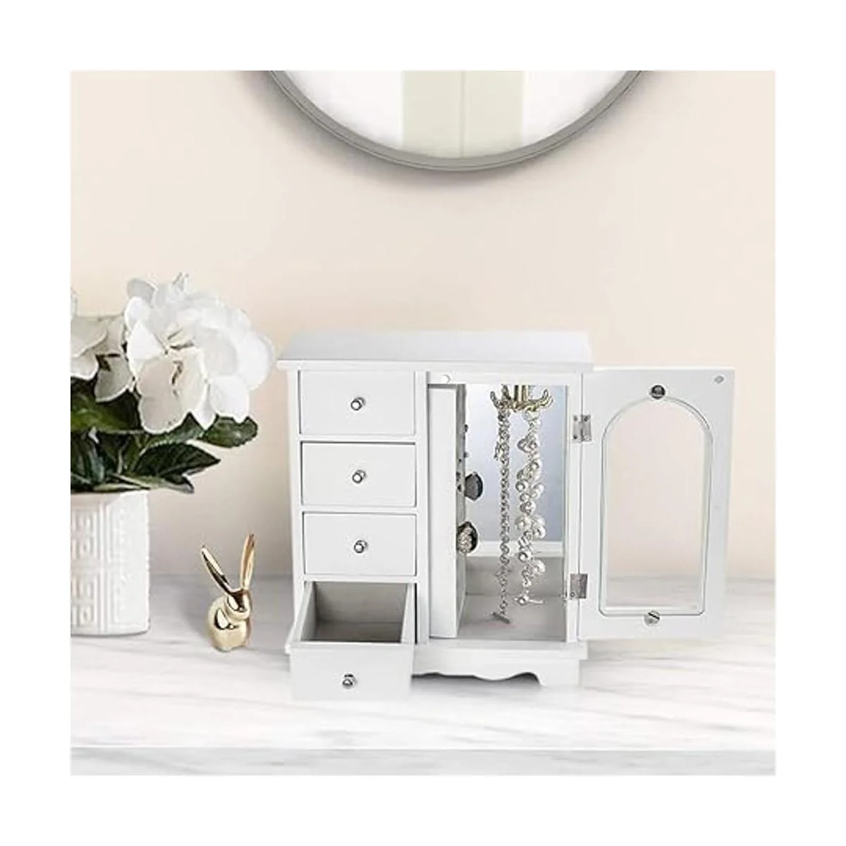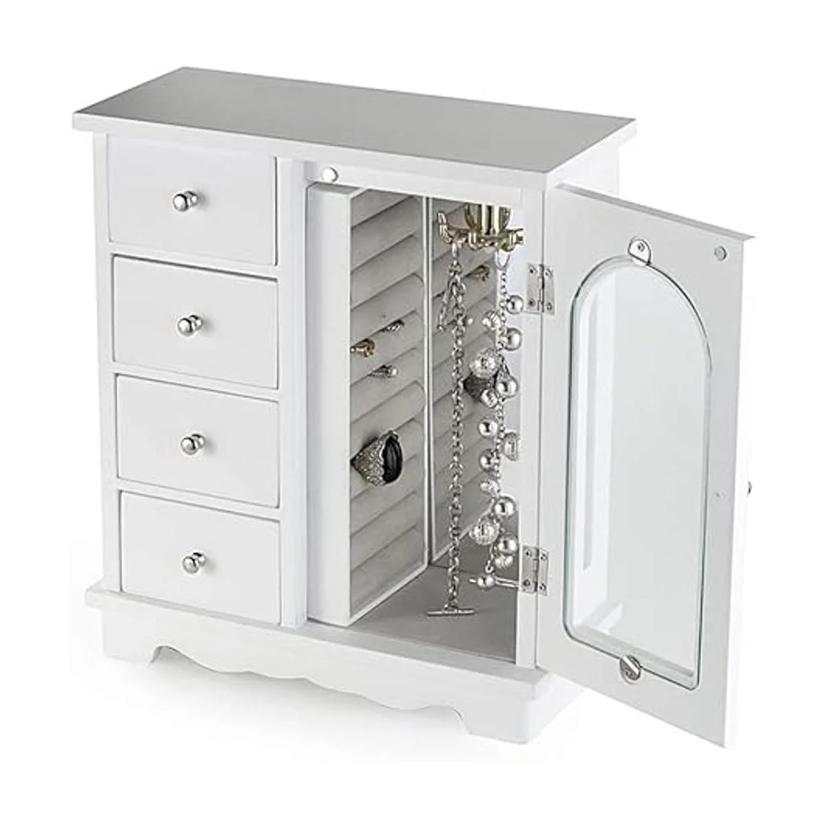 ZGZD Joyero blanco, organizador de maquillaje y accesorios de madera, almacenamiento de anillos para niñas con 4 cajones y puerta batiente