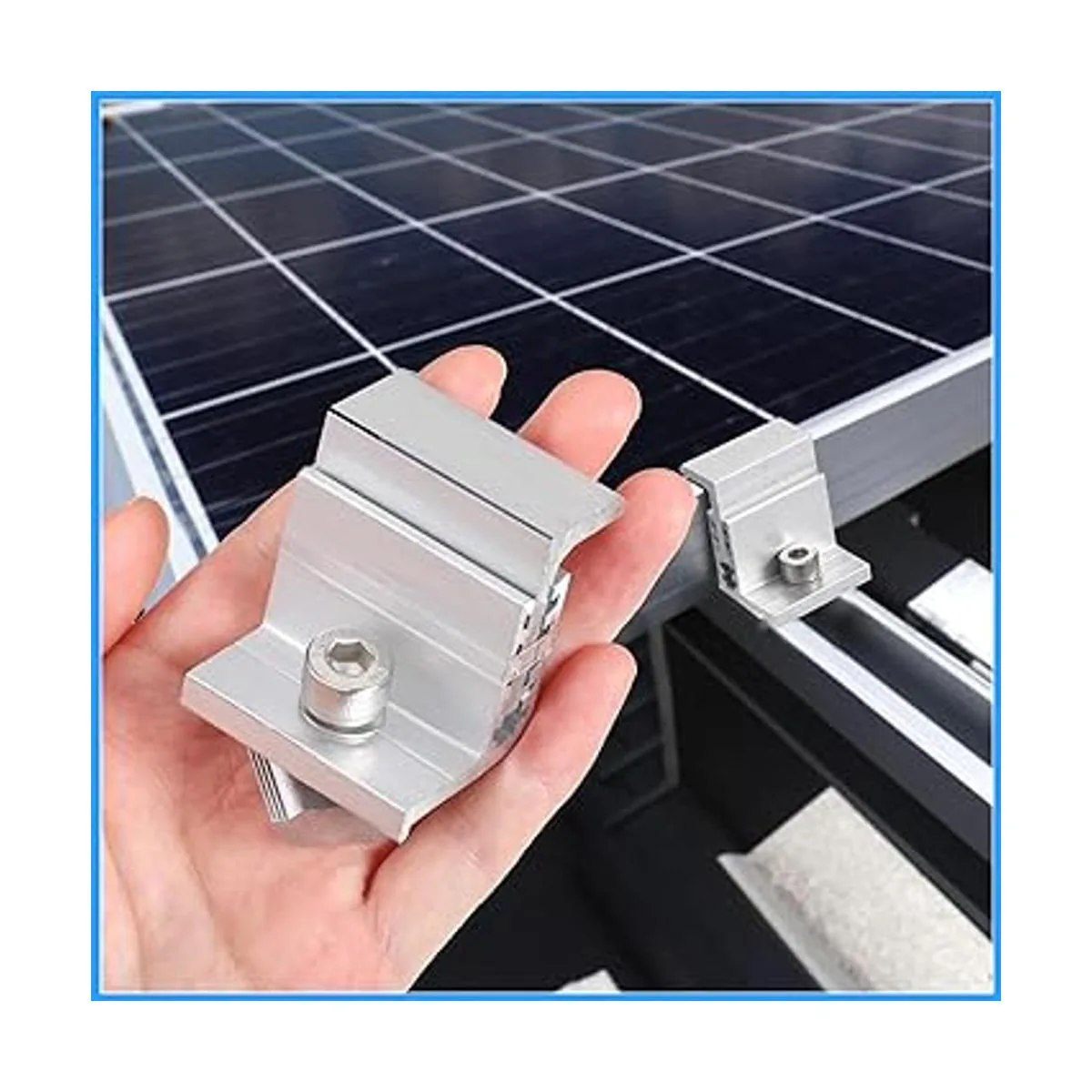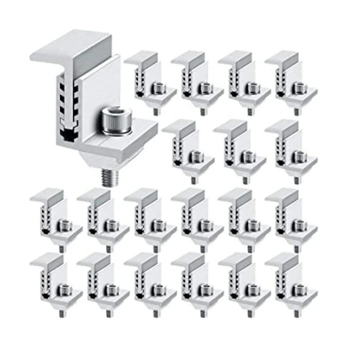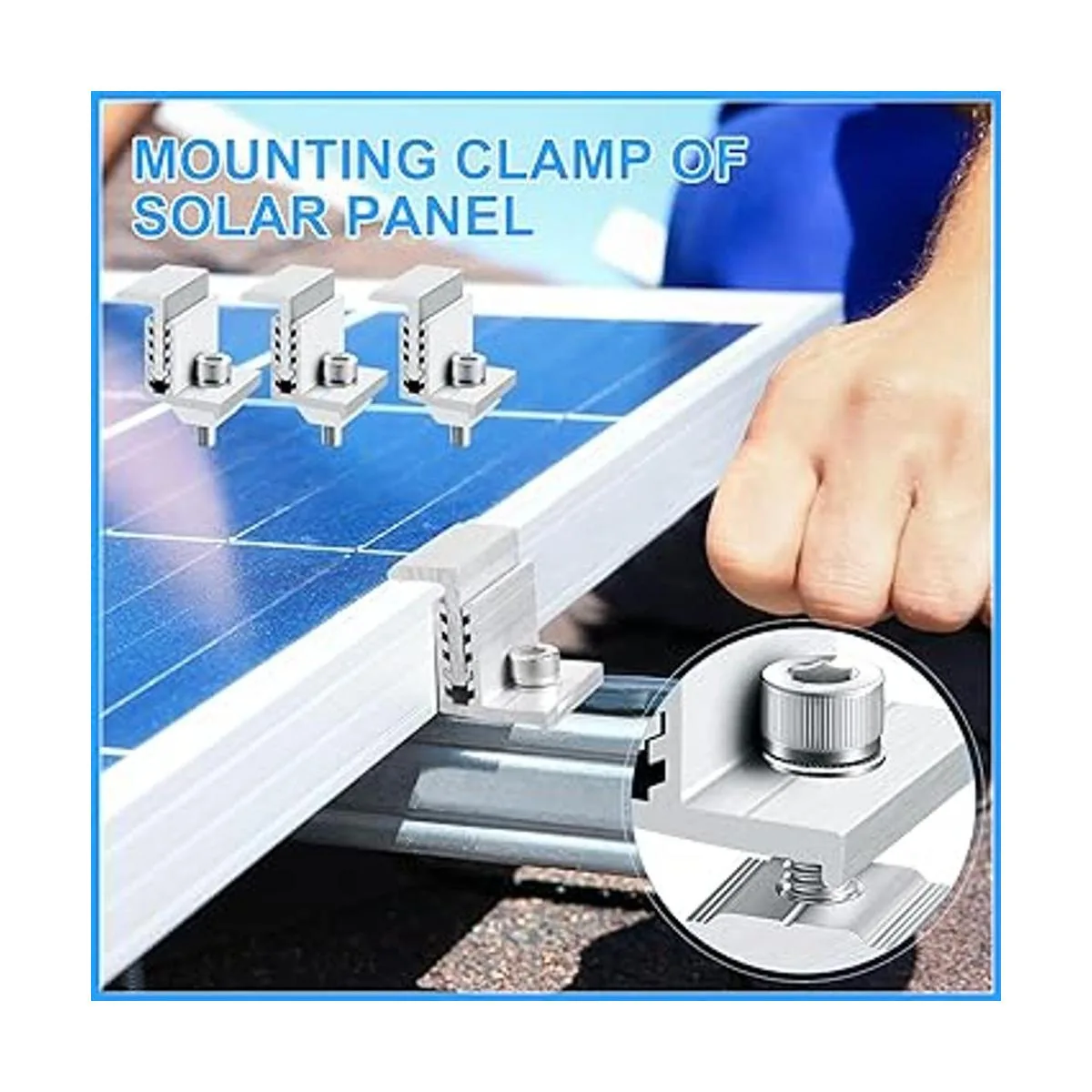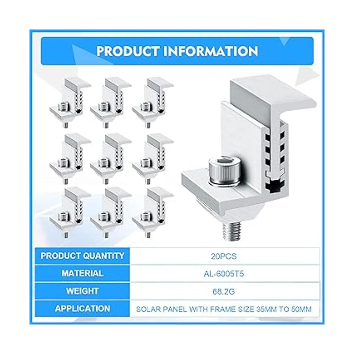 Zhengmy Abrazadera de extremo solar, montaje en panel solar, abrazaderas medias, abrazaderas de extremo de riel de aluminio, paneles ajustables, kit de canalón de conexión a tierra para panel solar, sistema de montaje fotovoltaico, accesorios de instalación paquete de 20