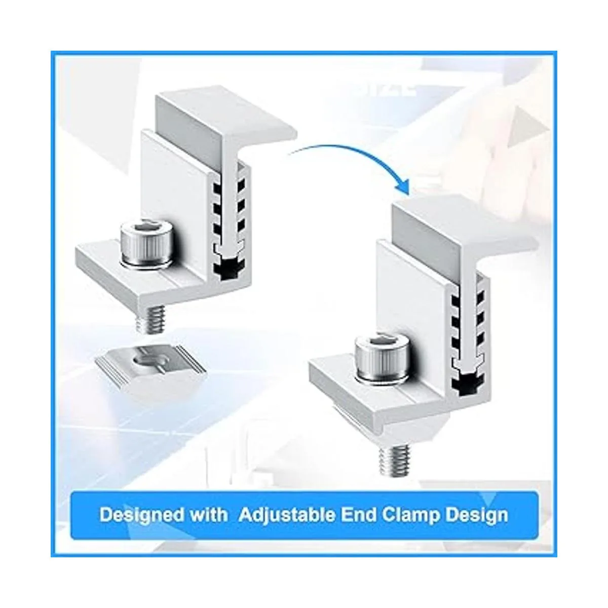 Amplia gama de aplicaciones: diseñadas con un diseño de abrazadera de extremo ajustable, estas abrazaderas de extremo solar ajustables de aluminio se pueden ajustar para diferentes paneles solares, adecuadas para paneles solares de marco que van desde 1.378 in a 1.969 in