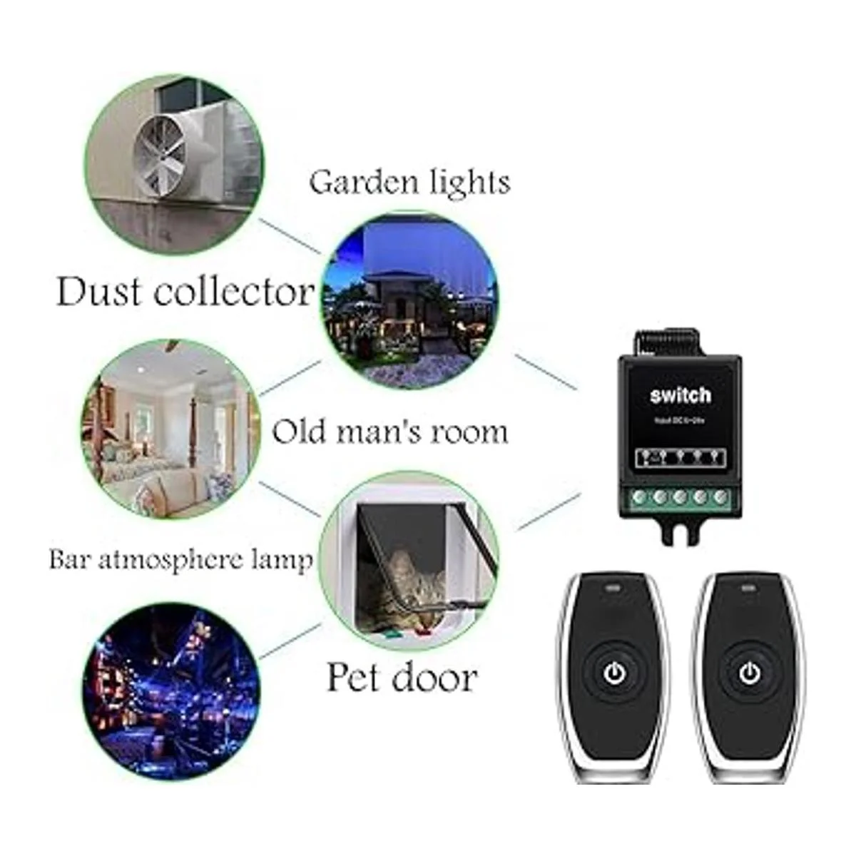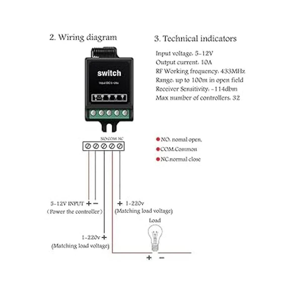Este interruptor de control remoto inalámbrico de 12 V, voltaje de entrada: 5 12 V. Carga de 1 V220 V de amplio rango. Corriente de salida máxima: 10 A. Adecuado para la mayoría de los electrodomésticos. El rango máximo es de hasta 328 pies sin obstáculos. Frecuencia de trabajo Rf: 433 MHz.
