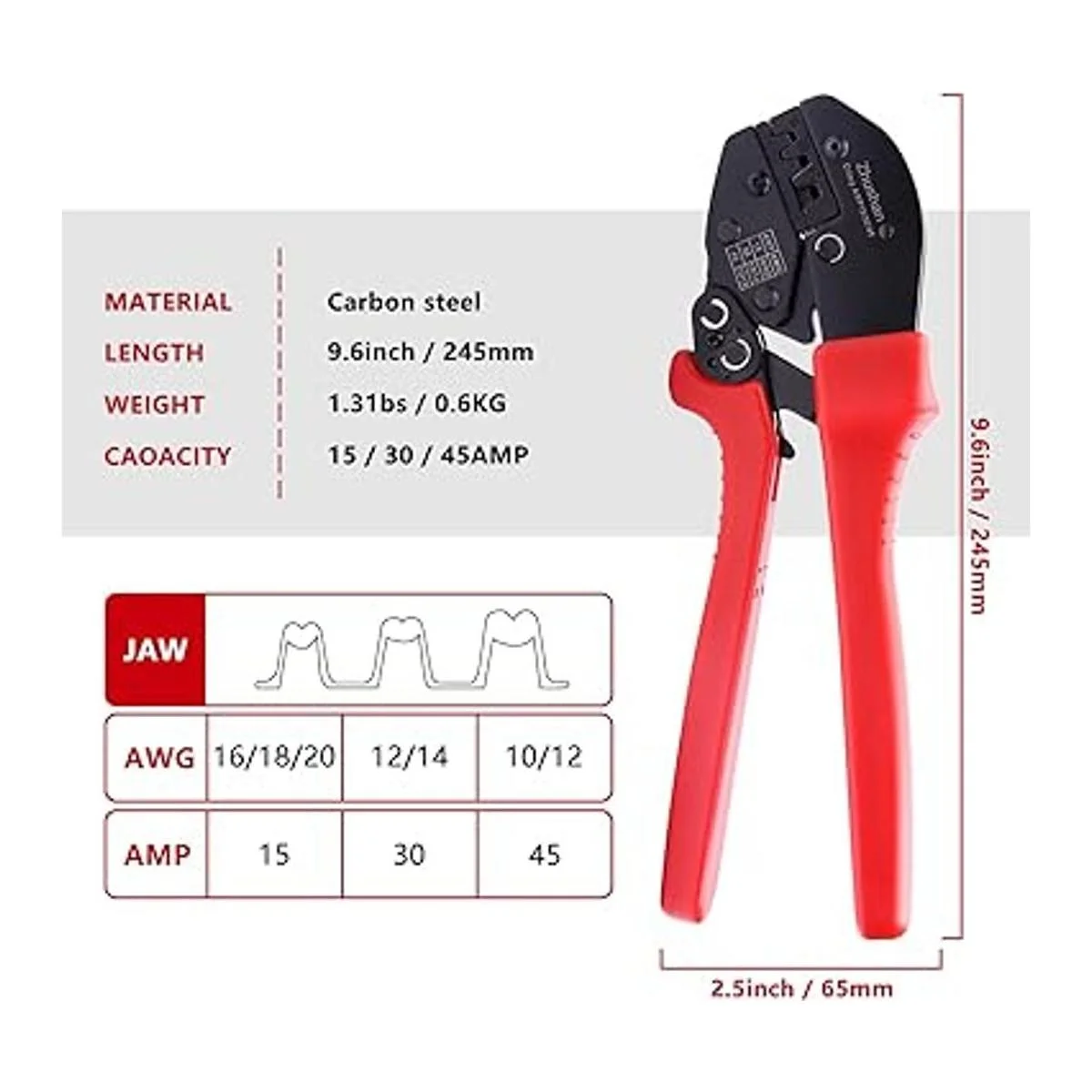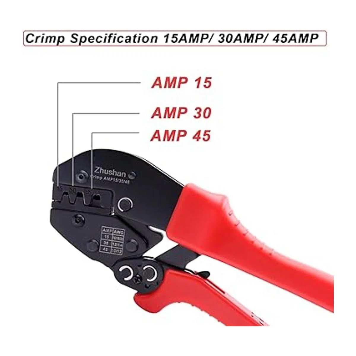 Material de alta calidad: los alicates de crimpado están hechos de acero de alto carbono con mango de PVC. Funciona para conectores de 15, 30 y 45 amperios