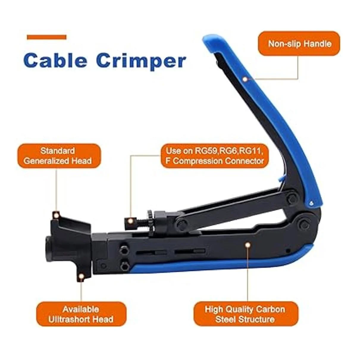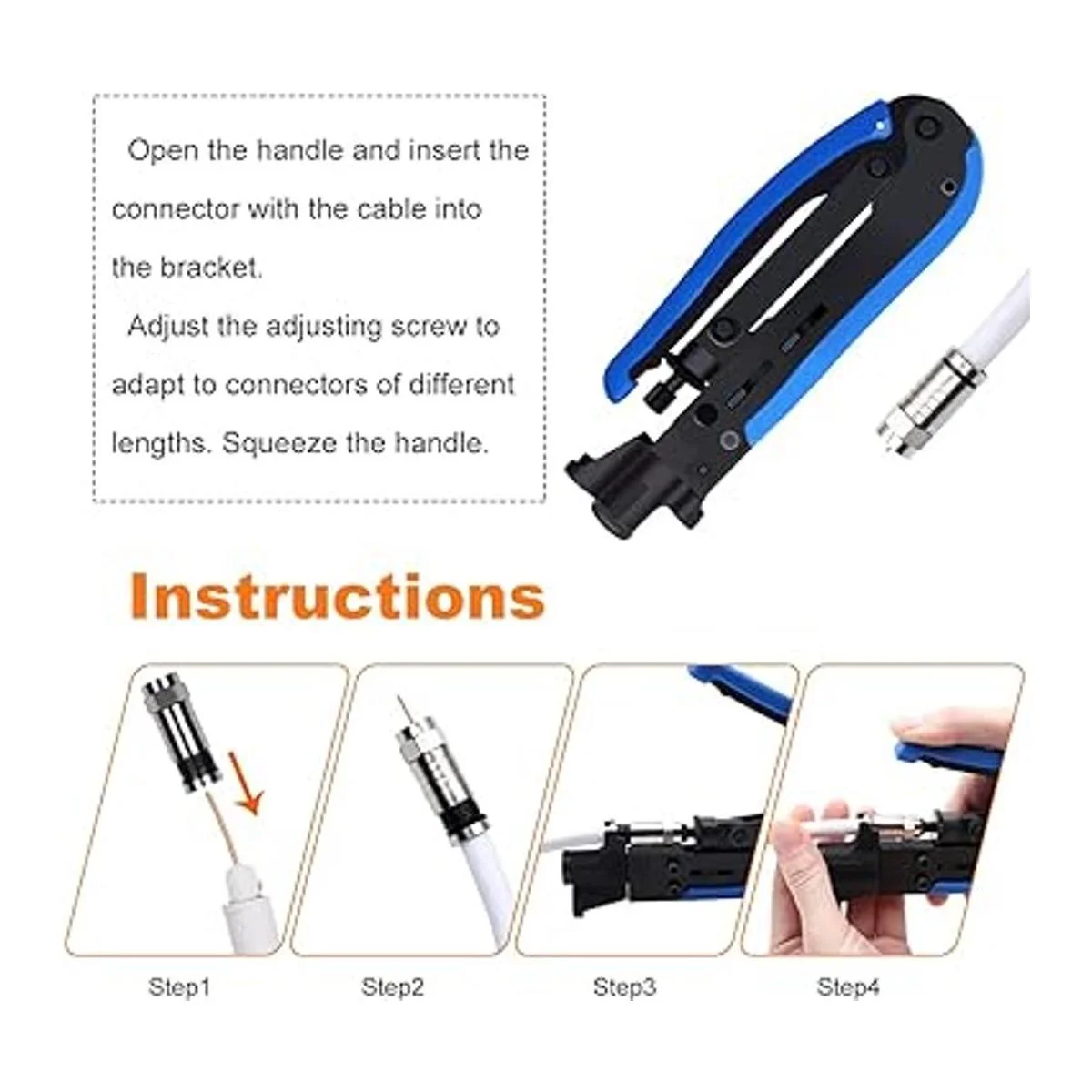 Capacidad: alterna rápida y fácilmente para la compresión de conectores RG6, RG11, RG7, RG58, RG59 en una sola herramienta, y comprime 7557 tipos de cabezales F métricos e imperiales. Ideal para posicionar adaptadores de la serie F, juego de herramientas de crimpadora de compresor de enchufe F