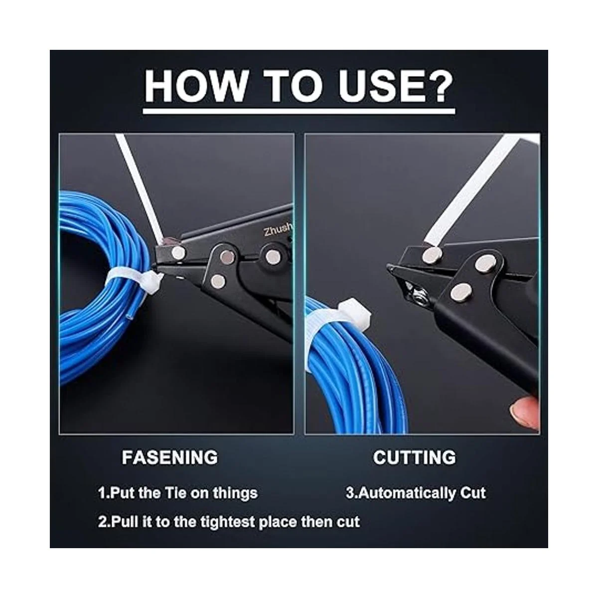 Aplicación: la herramienta de amarre de alambre se puede utilizar para cortar bridas de cables, trabajo eléctrico, construcción de rejilla de estado, construcción de cables subterráneos, construcción de edificios, etc
