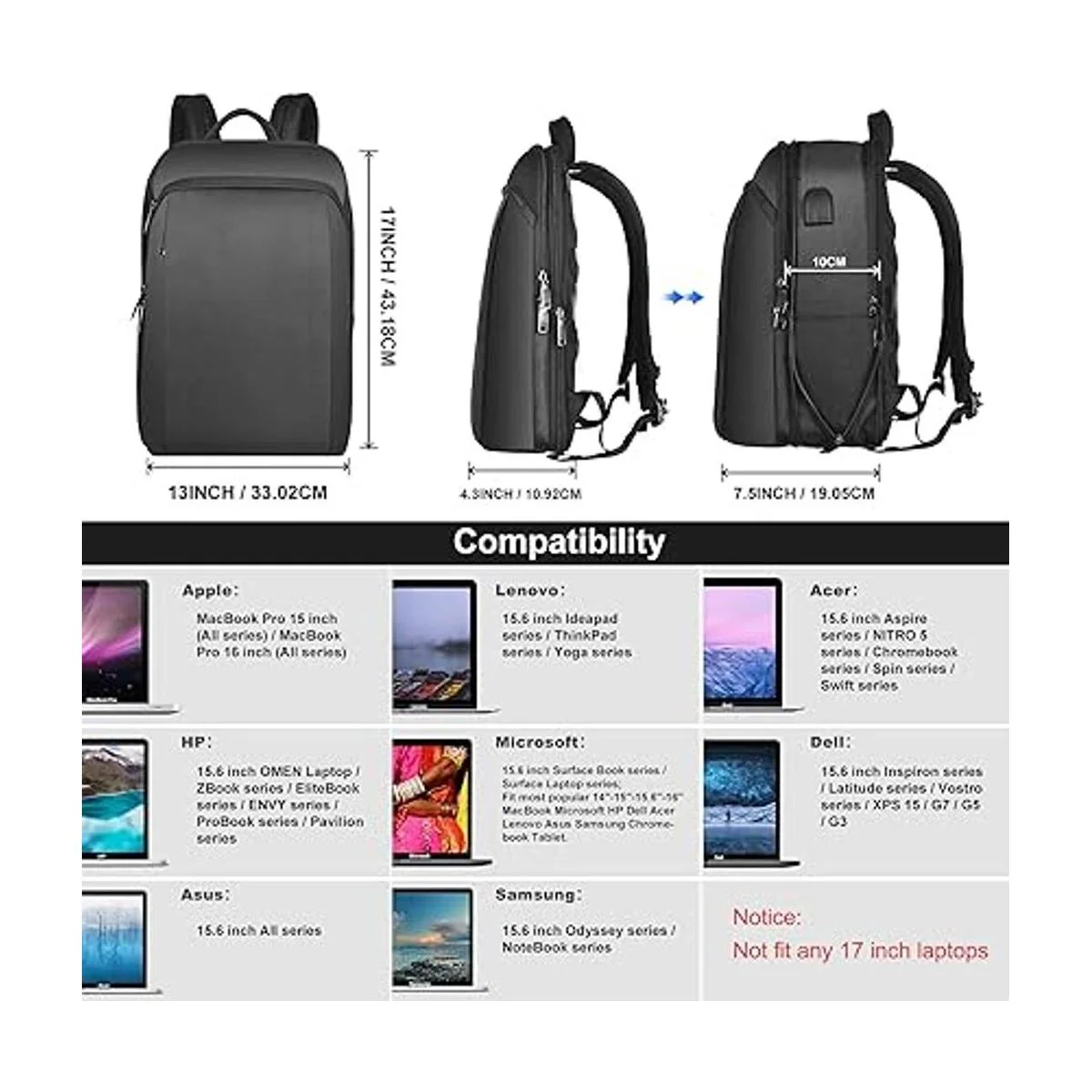 Compatibilidad y telas recicladas: la dimensión interior de la mochila para laptop: 16.9 x 12.6 x 3.9/7.1 pulgadas largo x ancho x alto, capacidad para MacBook de 13 pulgadas, 14 pulgadas, 15 pulgadas, 16 pulgadas, Surface Laptop, HP, Dell, Asus, Lenovo, Acer, Samsung. Esta mochila de viaje con tela reciclada duradera está hecha de botellas de plástico PET, mejor resistente al desgarro y al agua para protección de tu laptop mientras que también es respetuosa con el medio ambiente. Regalo perfecto para familiares y amigos. Aviso: no es compatible con portátiles de 17 pulgadas.