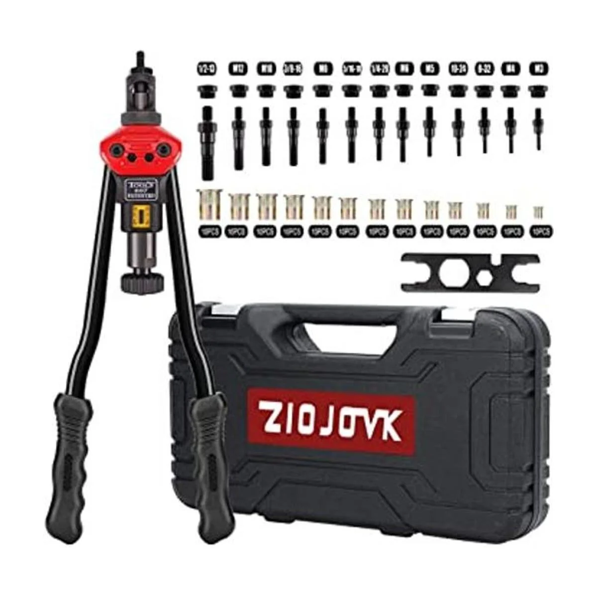 ZIOJOVK Herramienta de tuerca remachadora de 16 pulgadas, kit profesional de tuercas remachadoras que incluye 13 mandriles métricos y SAE, 130 tuercas remachadas surtidas, estuche de transporte resistente