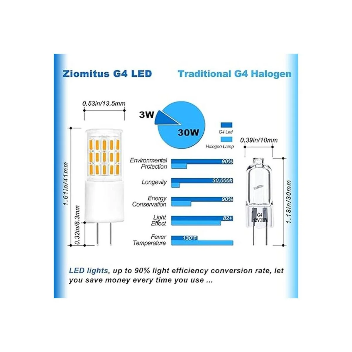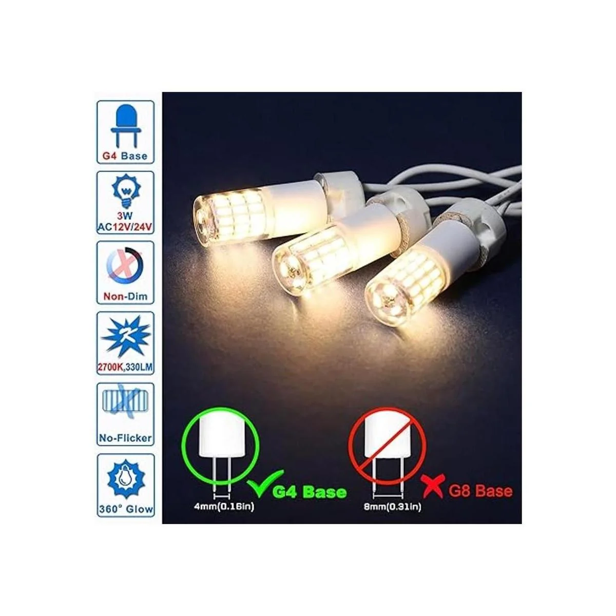 Nuestra ventaja: 1. La mayoría de los G4 en el mercado solo pueden funcionar con 12 V estable, nuestra bombilla G4 es de voltaje amplio CA/CC 1224 V, mejor compatibilidad, funciona bien con la mayoría de transformadores. 2. Lúmenes más altos, más brillantes.