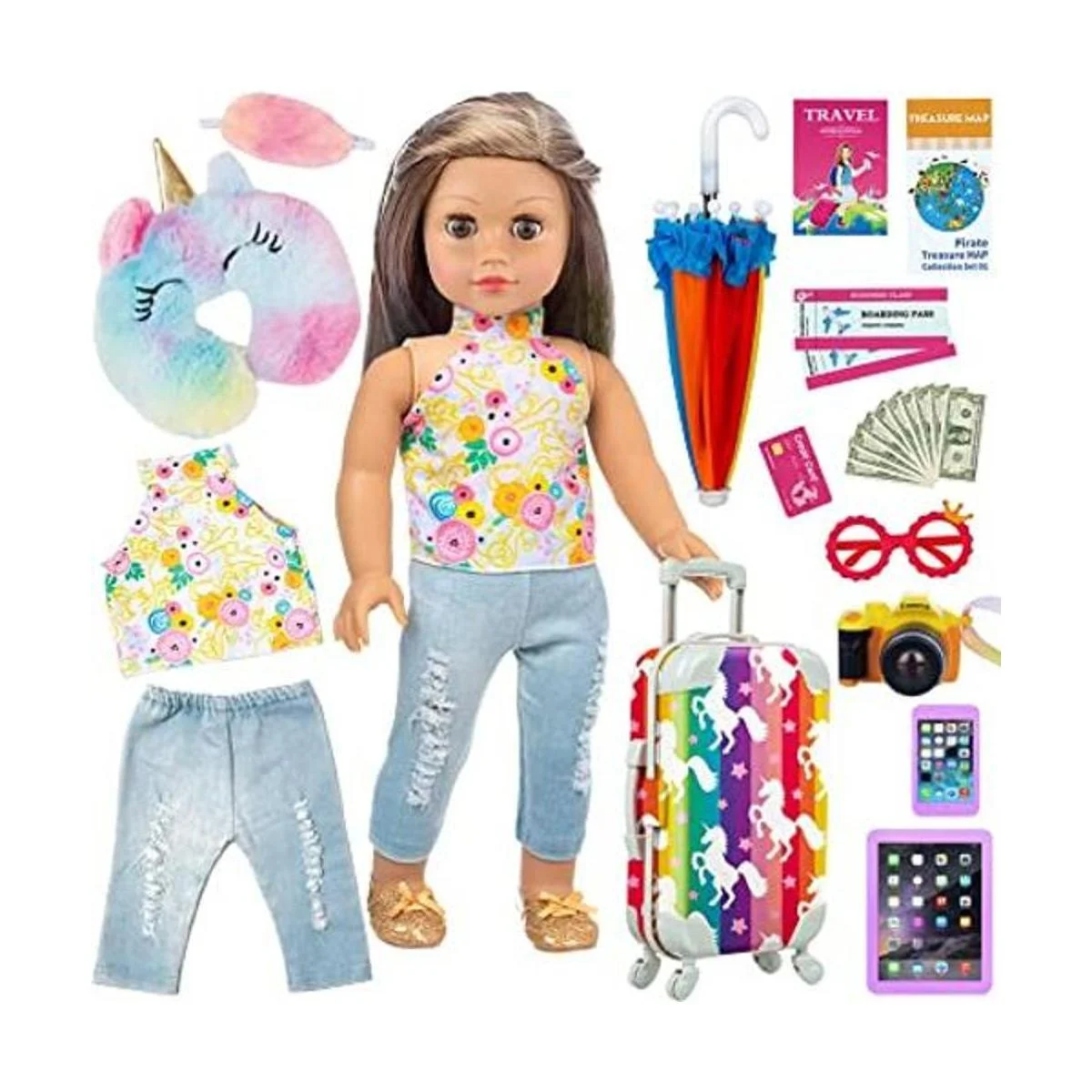 ZITA ELEMENT Juego de 24 piezas de ropa y accesorios de muñeca americana de 18 pulgadas para muñeca de 18 pulgadas y maleta de viaje con patrón de unicornio