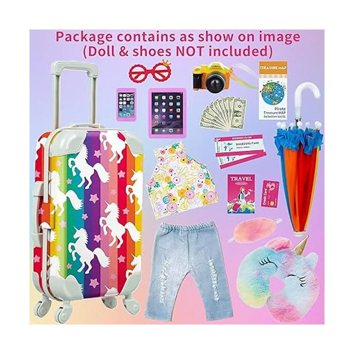 Paquetes como se muestra en la imagen, total 24 artículos: 1 juego de jeans, 1 maleta con patrón de unicornio, 1 almohada para el cuello, 1 máscara de ojos, 1 gafas de sol, 1 teléfono celular, 1 iPad, 1 paraguas, 1 cámara, 1 mapa, 1 pasaporte, 1 tarjeta de crédito, 2 billetes de avión y 10 dinero en efectivo. Ten en cuenta que las muñecas y los zapatos no están incluidos.