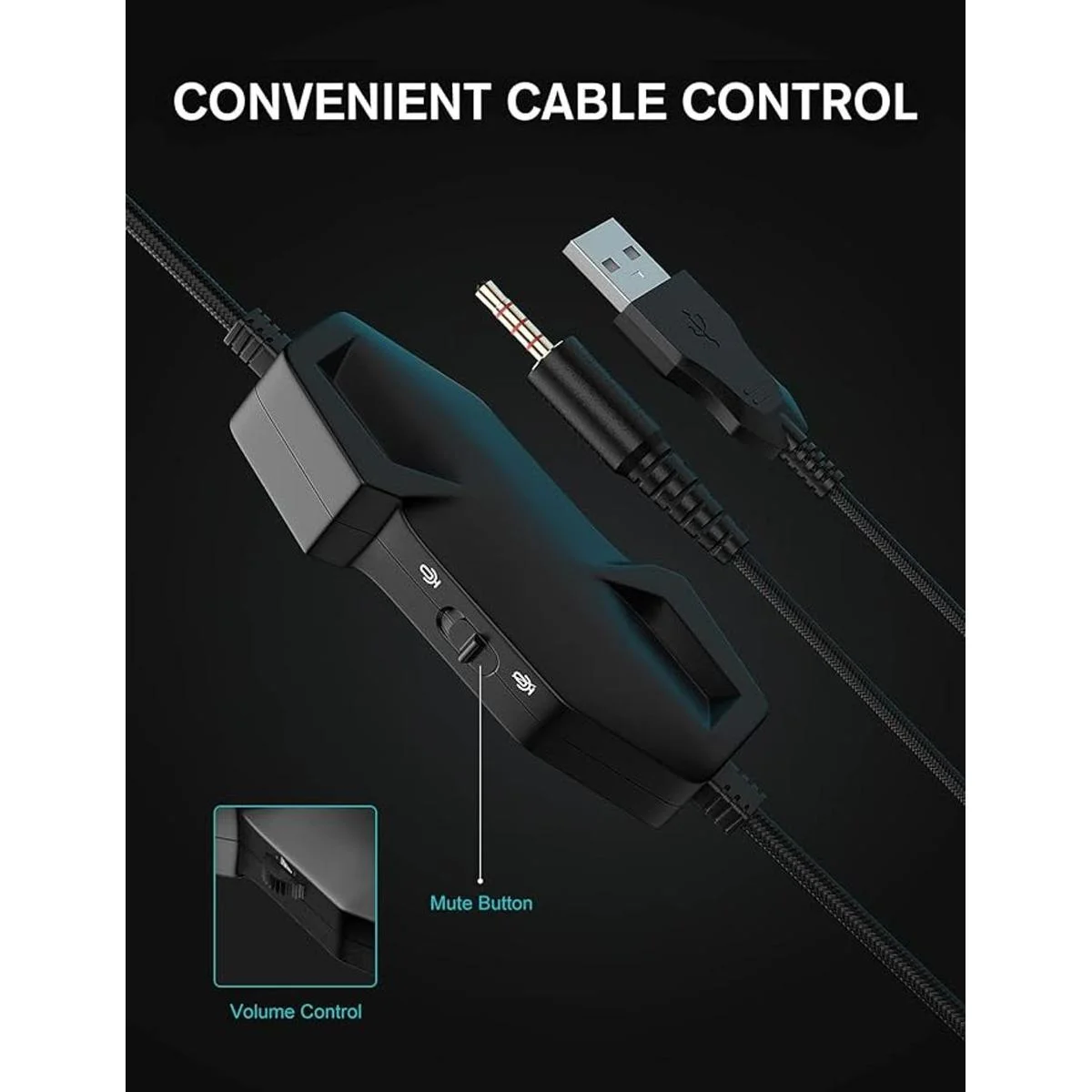 Control en línea sin esfuerzo. Nuestros auriculares para PC vienen con 6. Alta resistencia a la tracción, cable trenzado antibobinado con controlador de volumen giratorio y botón de silencio para el micrófono. Fácil de alcanzar, cómodo de usar. La conexión USB solo se utiliza para iluminar luces LED en movimiento.